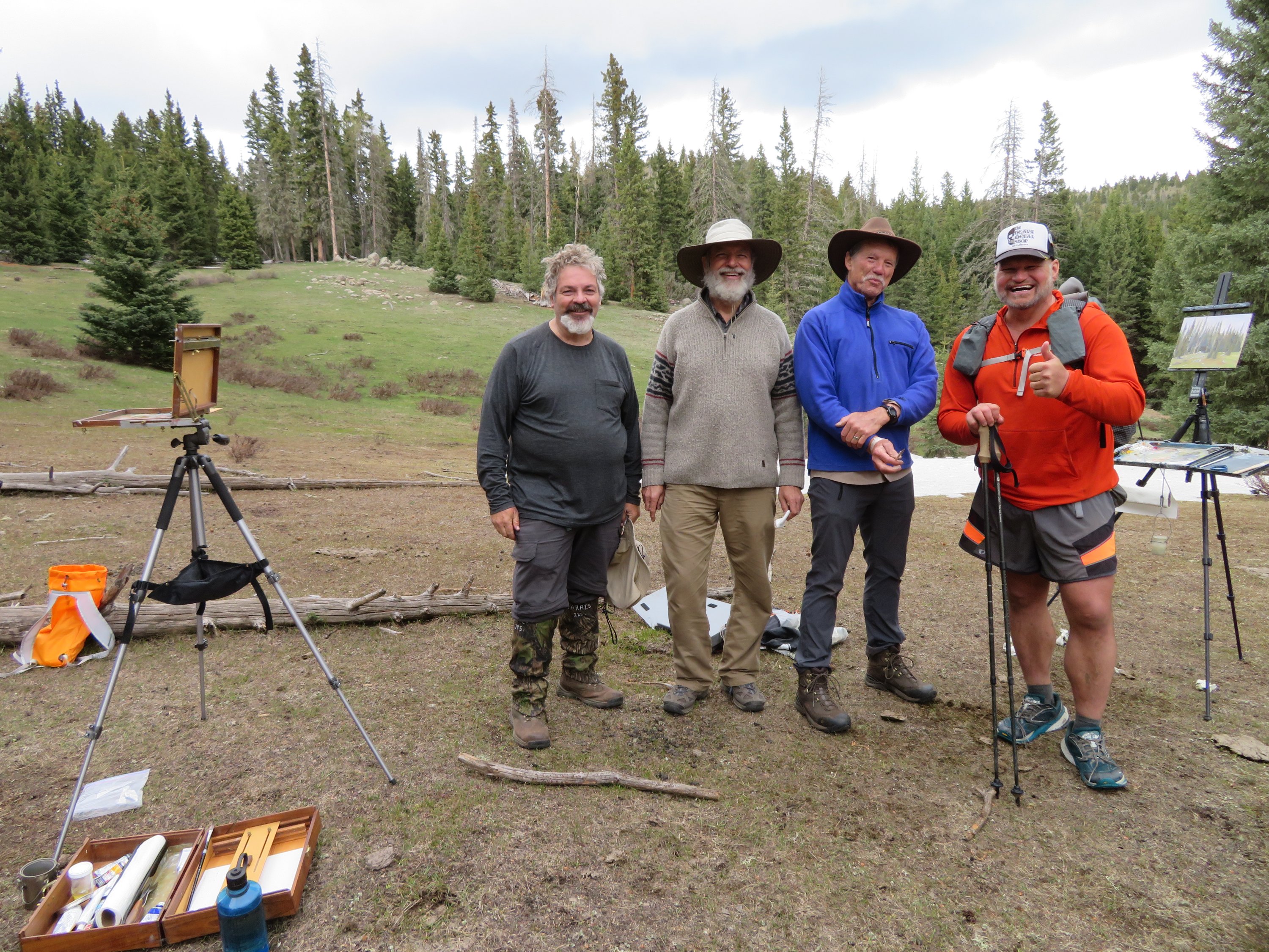 Auf dem Weg nach Ghost Ranch musste ich am zweiten Tag den San Pedro Gipfel überqueren und hatte gegen Mittag nach einiger Anstrengung das Plateau auf 3000 m erreicht. Nachdem ich wieder zu Atem gekommen bin und die Aussicht ein bisschen genossen hatte, machte ich mich weiter auf den Weg zum Gipfel. Ich lief um eine Kurve und dort bot sich mir ein absolut unerwarteter Anblick mitten auf dem Berg mitten im Nirgendwo. Drei Männer standen in einer Reihe jeder vor einer Staffelei vollkommen versunken in ihre Malerei. Zuerst war ich zu erstaunt, um zu verstehen, was ich da wirklich sah. Es war fast so als würde ich in eine Szene laufen. Ich wünschte, ich hätte ein Bild gemacht, weil es sich so unwirklich anfühlte. Obwohl sie malten, war es wie ein Moment der Stille und als wäre die Zeit angehalten. Natürlich bin ich hingegangen und wir hatten eine wunderbare Unterhaltung. Tatsächlich waren sie eine Gruppe von vier Männern in ihren Sechzigern, von denen die drei malten und ihr Freund unten am Fluss fischen war. Nach bereits vier Tagen auf dem Berg, war es ihr letzter Tag. Unten am Fluss hatten sie ihr Lager aufgeschlagen, tagsüber malten und fischten sie und am Abend hatten sie zusammen eine gute Zeit am Lagerfeuer. Leider fing es nach einer Weile an zu regnen, sonst hätte ich den ganzen Tag bleiben und ihren Geschichten zuhören können. Sie waren einfach die nettesten Männer! Das war einfach eine einzigartige Erfahrung, nicht nur, weil so unerwartet, sondern weil es wirklich großartig war diese Männer zu treffen, die ihrer Leidenschaft nach einem Abenteuer in der Wildnis und der Malerei folgen.