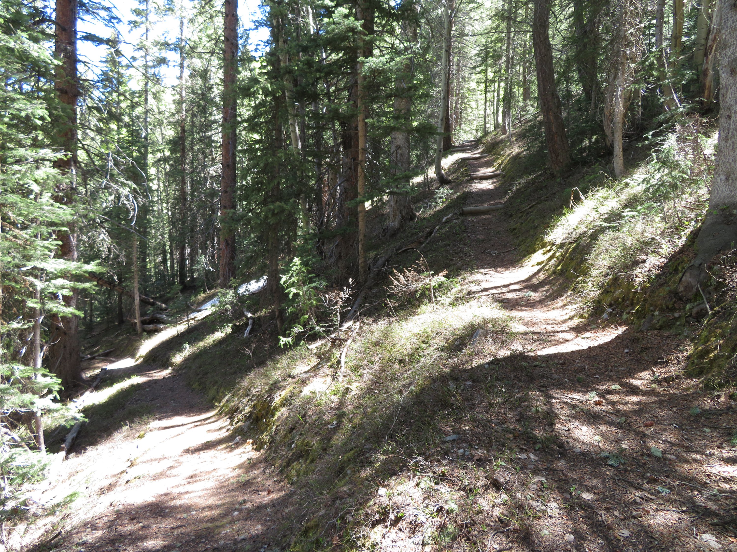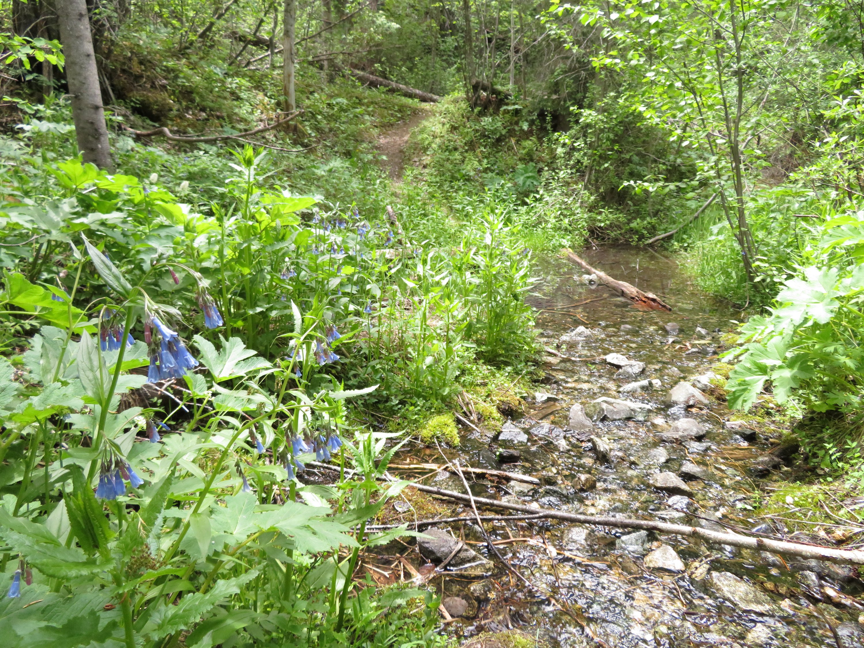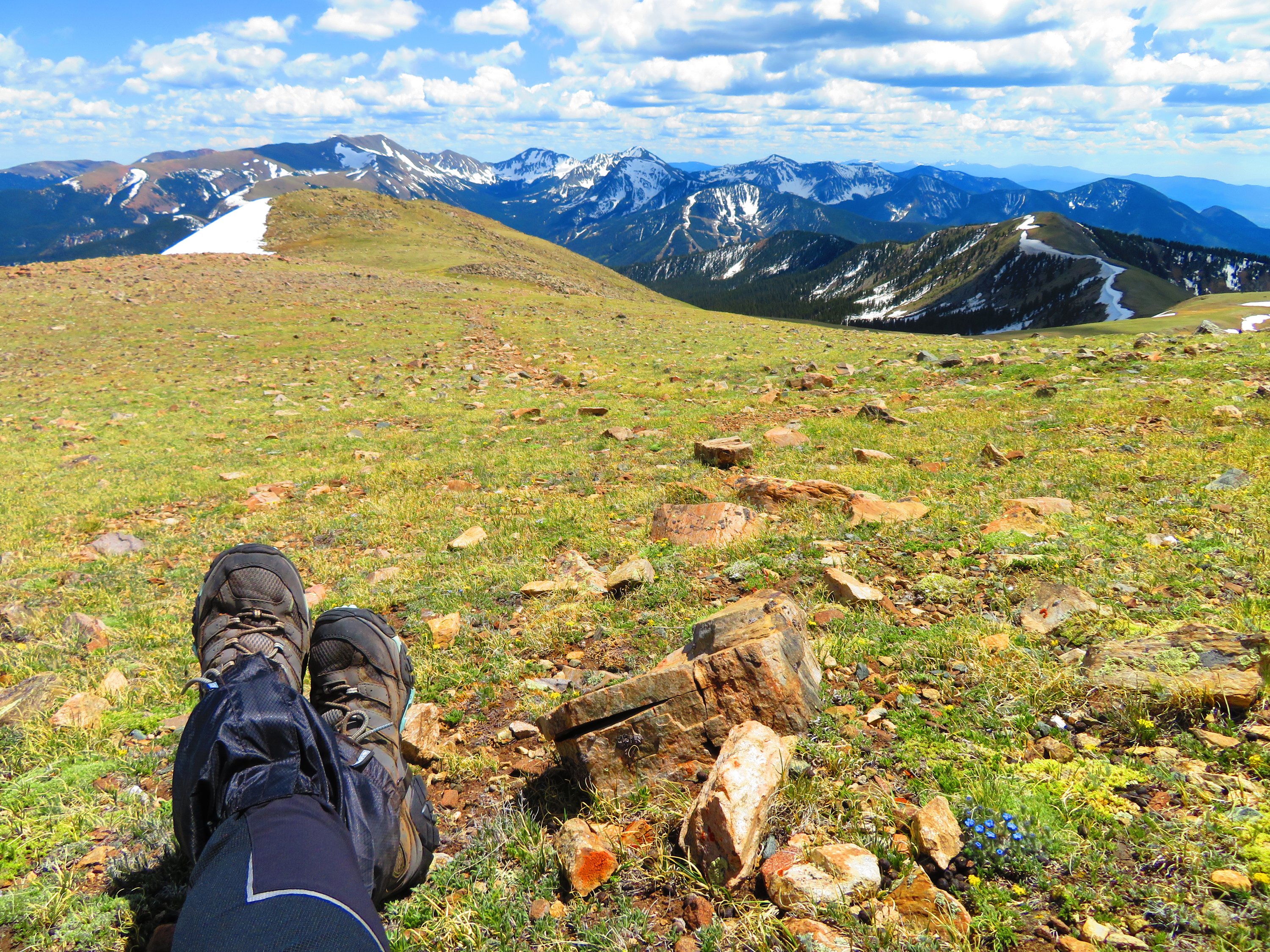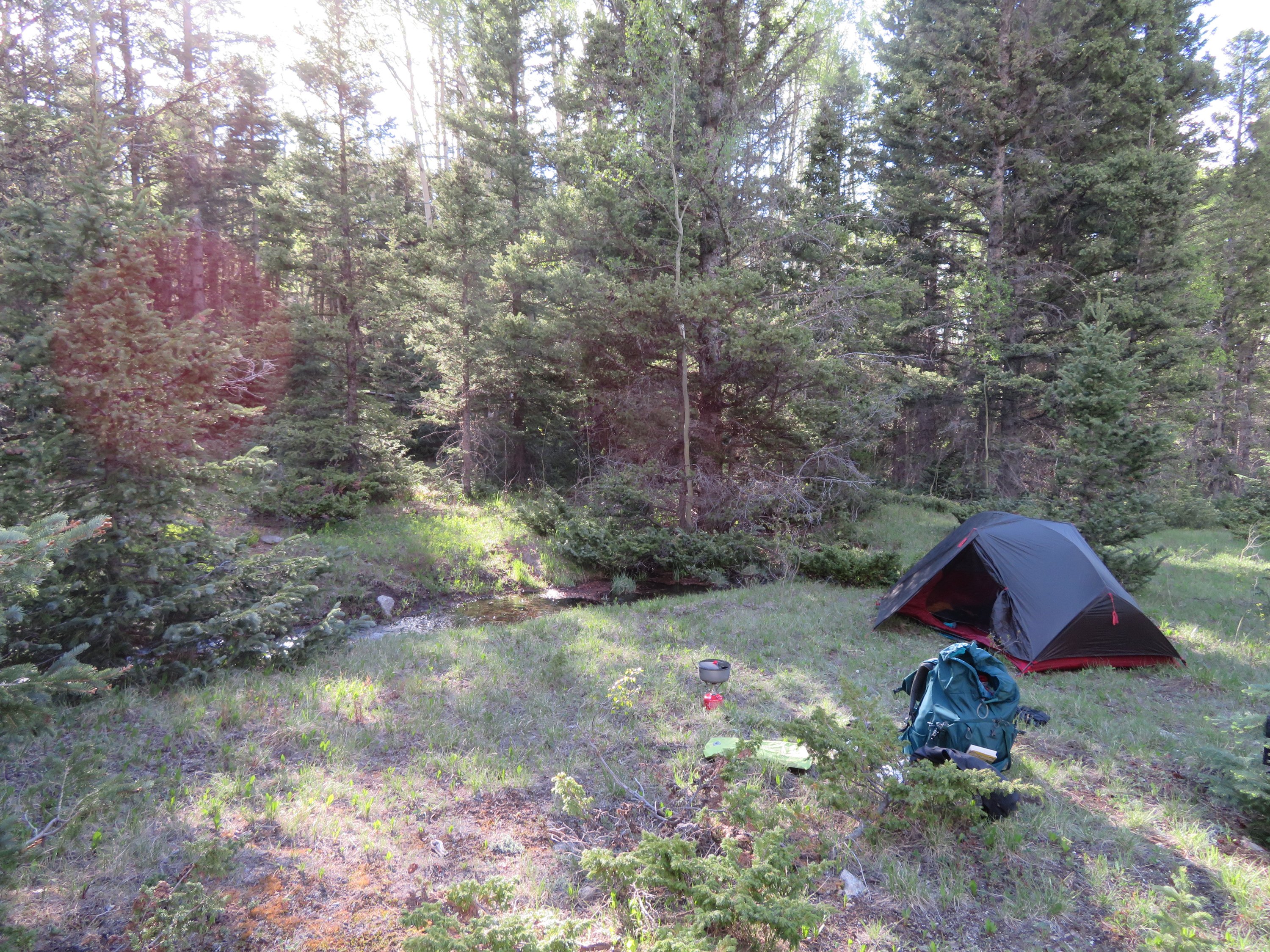 Four days of adventure in the mountains north of Taos in the Columbine Hondo Wilderness: avoiding thunder and hail, huffing and puffing up the mountain at snails speed postholing through lots of snow like going crazy on the stairmaster after sinking in knee deep with all my weight on… But being rewarded with the most amazing 360 degree view when finally I reached the top of the mountain. View of the Wheeler Peak and all the way to the snow covered mountains in Colorado! Being really glad that I wasn’t there but decided to come hike in this wilderness. Crazy winds at the top. But couldn’t help but to enjoy the view. When I was making my way back down I almost ran into snow again but decided I would just descend into another valley which looked inviting from above with a river meandering through grasslands protected by a young, incredibly green forest. It meant I had to climb down a really steep slope. But it was so worth it. As I felt like I arrived in paradise. Setting up my tent in the meadow next to the river with view of the mountain. And the next day it just continued as amazingly through a magical forest. And again it felt like hiking in spring with all kinds of beautiful flowers. Walking through the forest I decided to do my first barefoot hike. I made it through most of the day even though the rocky trails meant I only made slow progress. By the end of the day of course my feet were crazy tender. But I still hope that one day they will finally be really tough!! Also the advantage of walking barefoot was that I didn’t have to constantly take off my shoes for crossing what felt like a countless number of rivers.