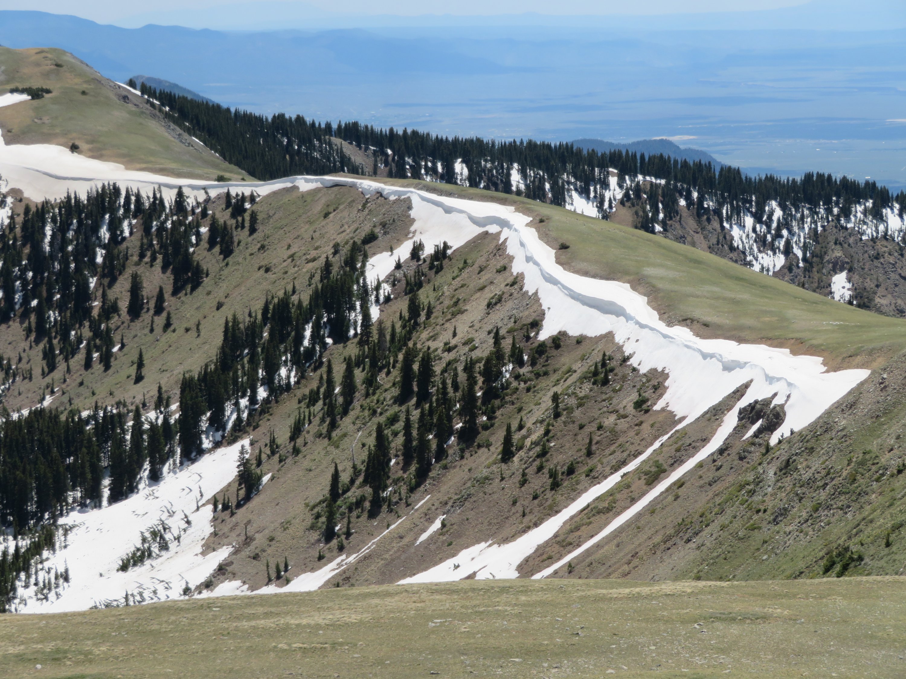Ich wusste, dass ich auf meiner Wanderung in den Bergen mit Schnee rechnen musste. Hoffte aber, dass wenn ich hauptsächlich auf der Nordseite wandern würde, dort der meiste Schnee schon geschmolzen war. Aber bereits der Aufstieg durch einen Canyon, in welchem tagsüber nur wenig Sonne schien und der im Schutz der Bäume lag, führte mich durch jede Menge Schnee. Was bedeutete, dass ich mich wieder durch teilweise knietiefen Schnee kämpfen musste, was mit dem ganzen Gewicht so richtig anstrengend ist. Und daher eine gefühlte Ewigkeit brauchte bis ich oben angekommen war. Ich hatte mir noch keine Route ausgesucht, sondern wollte mich dann entscheiden, sobald ich eine bessere Vorstellung von den Verhältnissen der Wege hatte. Was mir zum Glück möglich war als ich den Gipfel erreichte und einen super Blick über die gesamte Bergkette hatte. Und feststellen musste, dass es doch noch an vielen Stellen ziemlich viel Schnee gab. Also versuchte ich mit Hilfe der Karten einzuschätzen, wo die Wege entlangführten und, anhand dessen was ich sehen konnte, die Verhältnisse zu bewerten. Und alle möglichen Alternativen durchspielend. Meine Chancen auf wenig Schnee standen natürlich am besten, wenn ich Wege wählte, die in geringerer Höhe verliefen. Aber ich wusste, dass ich letztendlich wieder über den Bergkamm musste, um zurück zur Straße zu kommen. Während ich weiterwanderte, war ich ständig am Karten überprüfen, einschätzen und bewerten…und baute damit Bedenken in mir auf, die mich dann für ganze weitere Wanderung begleiteten. Bis zum letzten Tag als ich den Berg wieder hinaufsteigen musste. Ich hatte mir vorgestellt wie ich mich wieder durch den Schnee kämpfen musste, wie anstrengend es sein und wie viel Zeit ich brauchen würde…und freute mich nicht wirklich darauf. Nur, als ich dann tatsächlich den Aufstieg begann, war es überhaupt nicht so, wie ich es mir vorgestellt hatte. Es gab nur wenige Schneeflecken auf dem Weg, der sich den Berg hinauf schlängelte. Die Bedingungen waren anders als im Canyon und der Weg folgte einem Hang hinauf, den ich aus der Ferne nicht hatte sehen können. Letztendlich habe ich diesen Teil der Wanderung sehr genossen.