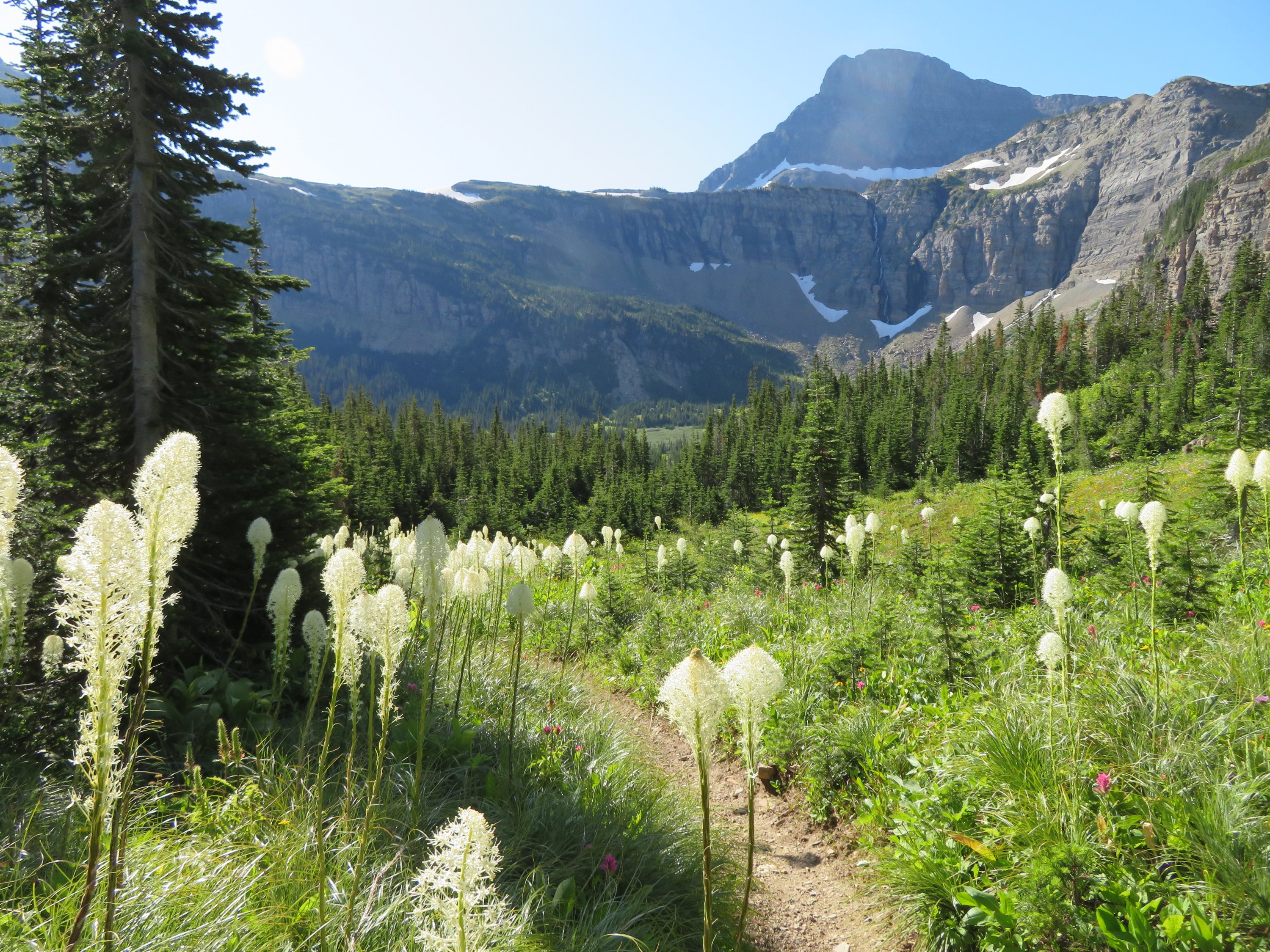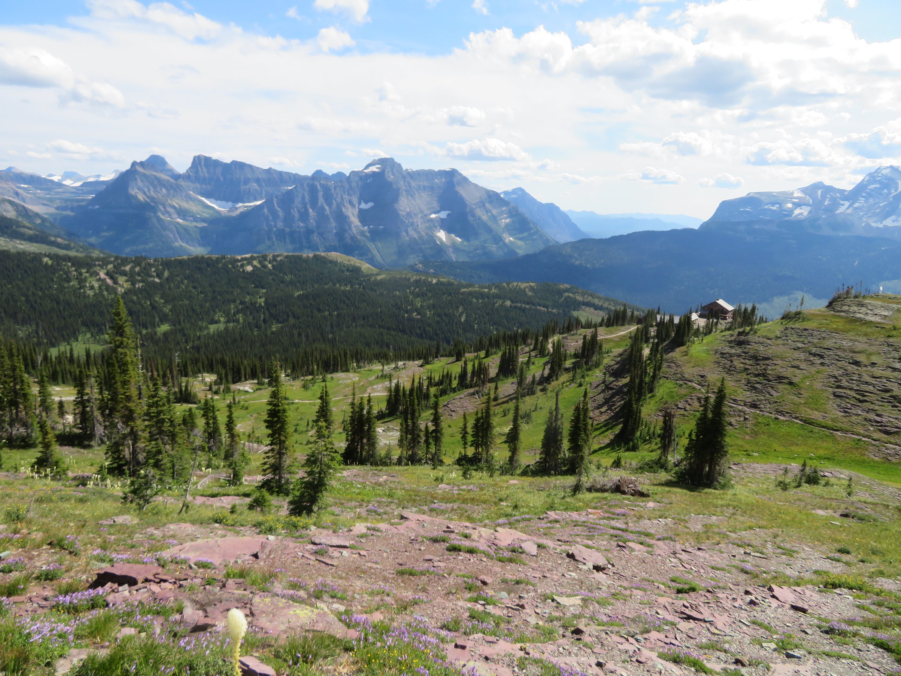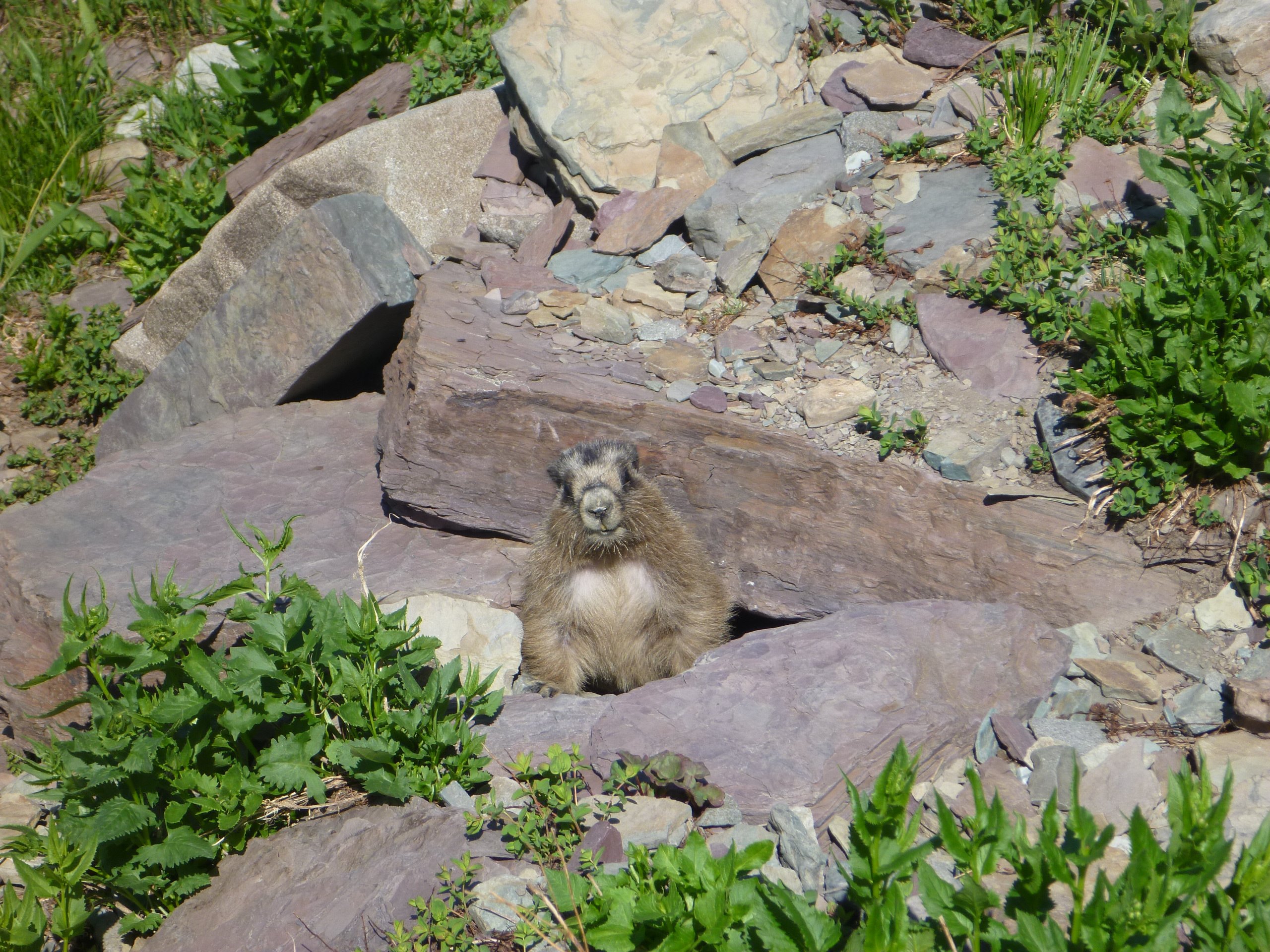 Das feierten wir mit zwei gewaltigen Kugeln super leckeren Eis. Und machten uns dann am nächsten Morgen auf zu unseren letzten sechs gemeinsamen Wandertagen. Durch die unglaubliche Schönheit des Glacier NP! Mit sechs Tagen perfektem Sommerwetter. Blauem Himmel und toller Aussicht. Womit wir wirklich viel Glück hatten, denn häufig gibt es Dunst oder sogar Sperrungen wegen Waldbränden in der Nähe. An manchen Tagen war es sehr heiß, aber in den höheren Lagen wehte immer eine kühle Brise. Und es gibt jede Menge Seen, in die man zur Abkühlung springen konnte. Zu dieser Jahreszeit zu wandern, bedeutete, dass wir eine Fülle an wilden Blumen gesehen haben. Oft hatten wir das Gefühl durch einen botanischen Garten zu laufen, nicht nur wegen der Vielfalt der Blumen, sondern auch wegen der Düfte. Und auch wenn wir nicht allzu viele wilde Tiere gesehen haben, möglicherweise wegen des Rufens…, so haben wir immerhin die Bären, Hirsche, ein Bighornschaf und Bergziegen gesehen. Und viele Murmeltiere, Eichhörnchen und Präriehunde.