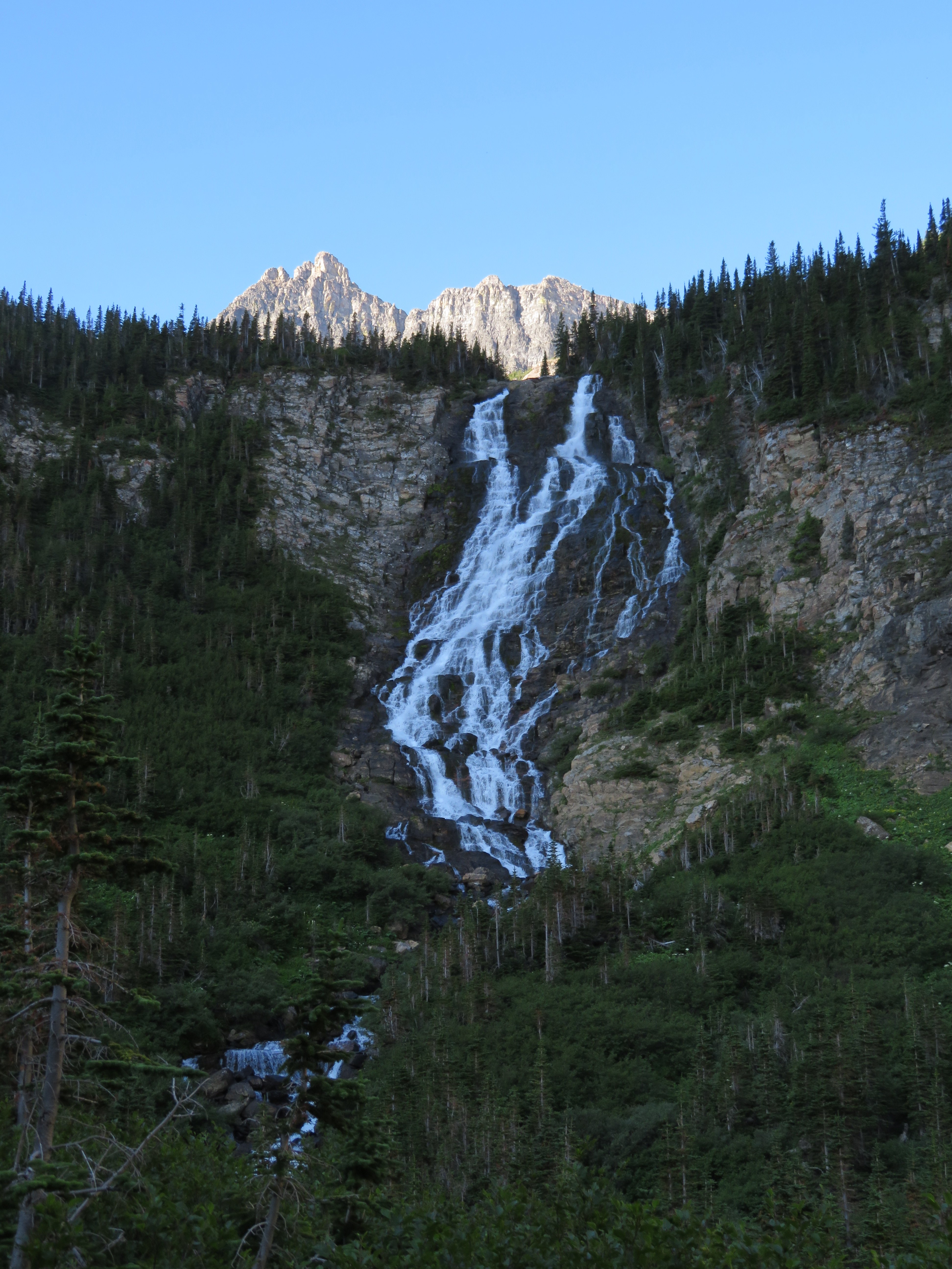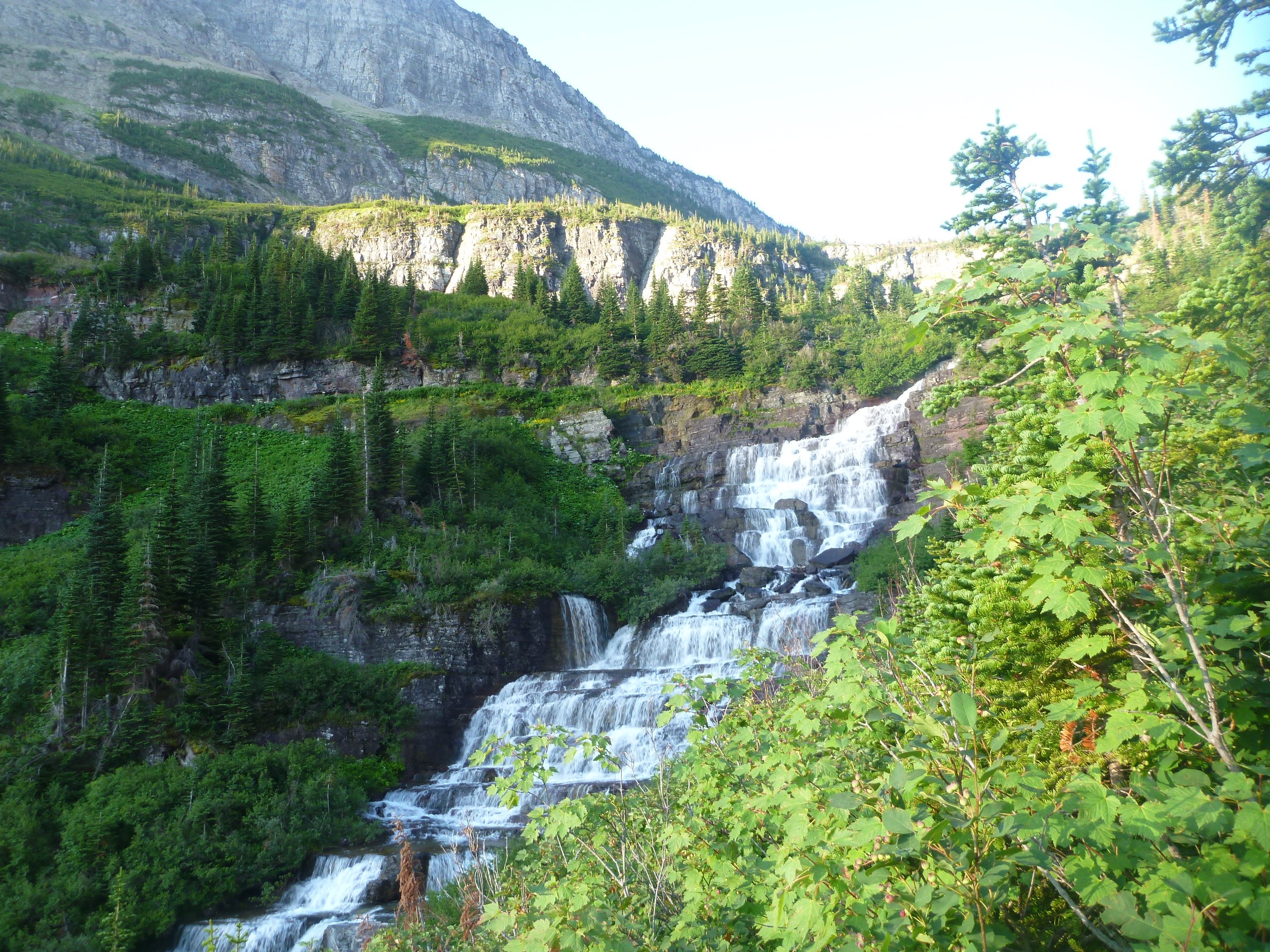 Wir starteten unsere Wanderung mit dem Loop hinauf zum Granite Chalet. Ein ziemlich anstrengender Aufstieg, vor allem weil unsere Rucksäcke da am Anfang der Wanderung noch voller Essen und damit am schwersten waren. Vom Chalet aus ging es nur ein Stück weiter bergauf zum Swiftcurrent Pass, wo wir mit einem unbeschreiblichen Blick zum Many Glaciers belohnt wurden. Und einer tollen Wanderung hinab entlang schmaler Pfade und an Wasserfällen vorbei.
