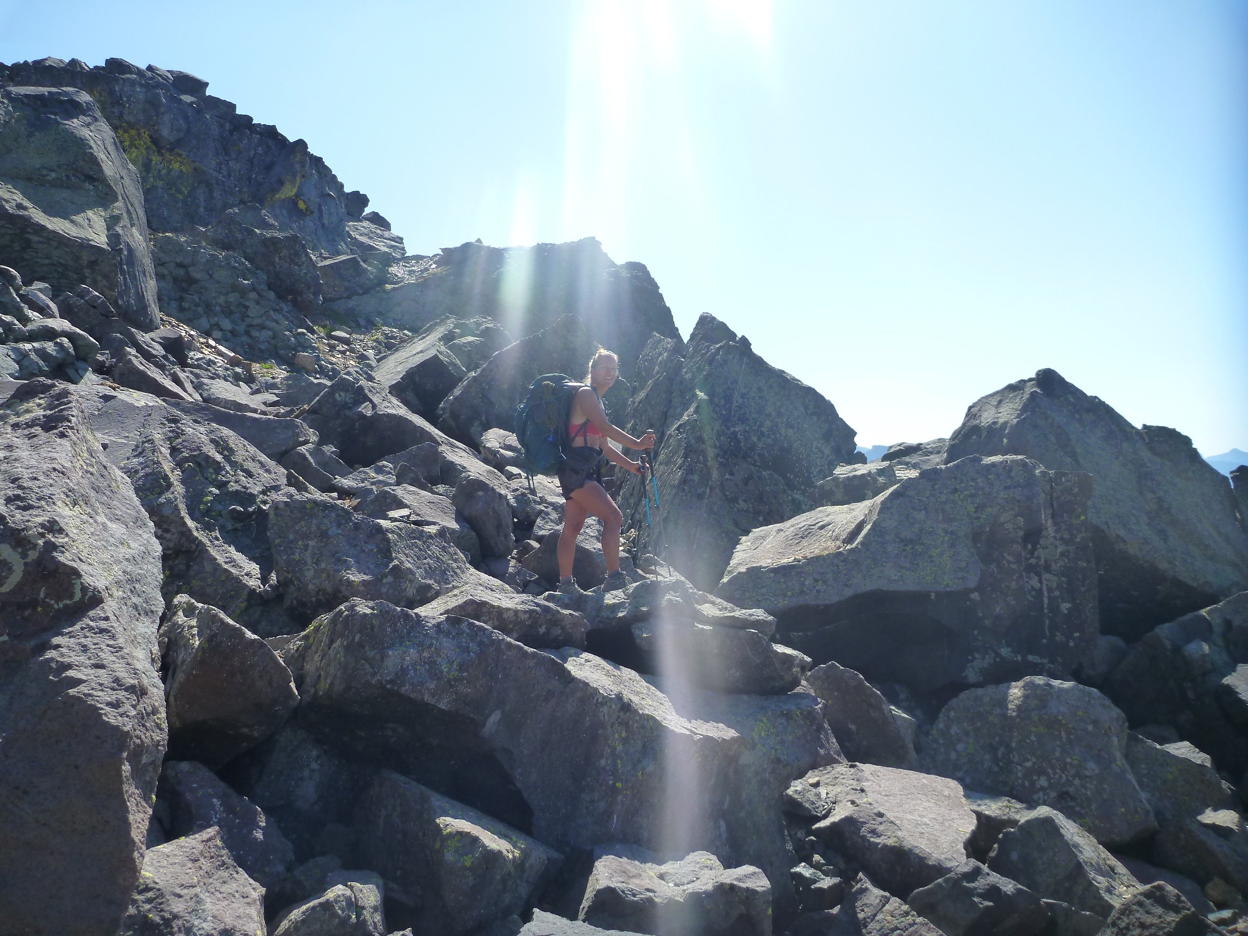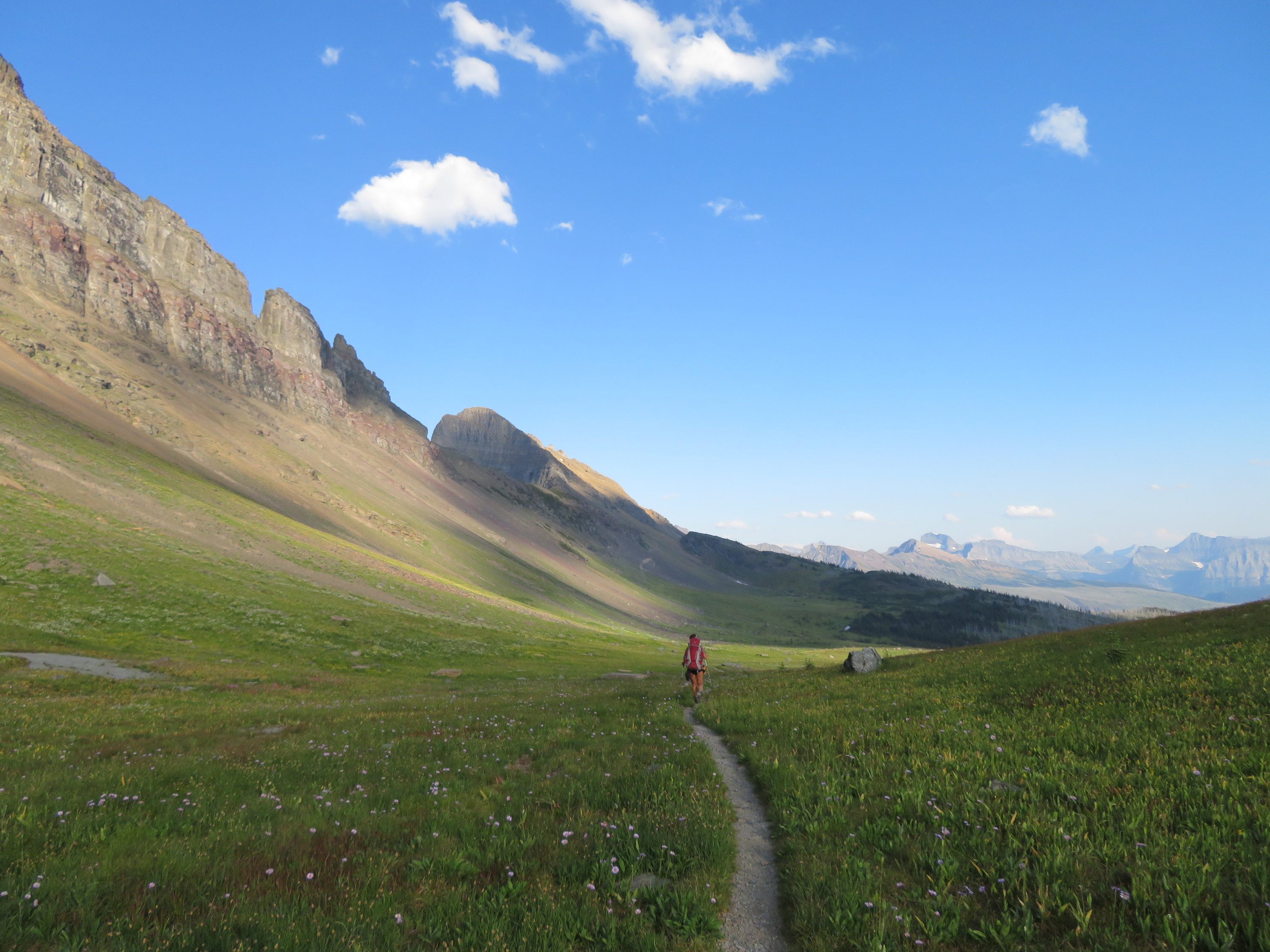 Der entspannte Tag war super, denn am nächsten Tag hatten wir nicht nur unseren längsten Abschnitt vor uns, sondern auch einen steilen Aufstieg zum Stoney Indian Pass. Von dort ging es auf der anderen Seite den ganzen Weg wieder hinunter, nur um dann alles wieder zum Fifty Mountain hochzuklettern. Es war eine wunderschöne Wanderung. Auch wenn wir teilweise nur langsam vorankamen, da der größte Teil des Weges völlig zugewachsen war. Manchmal hatte man das Gefühl durch den Dschungel zu wandern. Auch weil es wegen der dichten Vegetation echt heiß und humid war. Das hat mich an Liberia erinnert und manchmal hätte ich mir eine Machete gewünscht, wie wir sie da hatten, um den Weg freizuschlagen, wenn wir vor lauter Gebüsch unsere Füße nicht sehen konnten oder uns den Weg nur erahnend durch schulterhohe Pflanzen schieben mussten. Aber viele der Pflanzen waren auch Blumen, was also nicht nur himmlisch dich, sondern oft auch einfach nur magisch war.