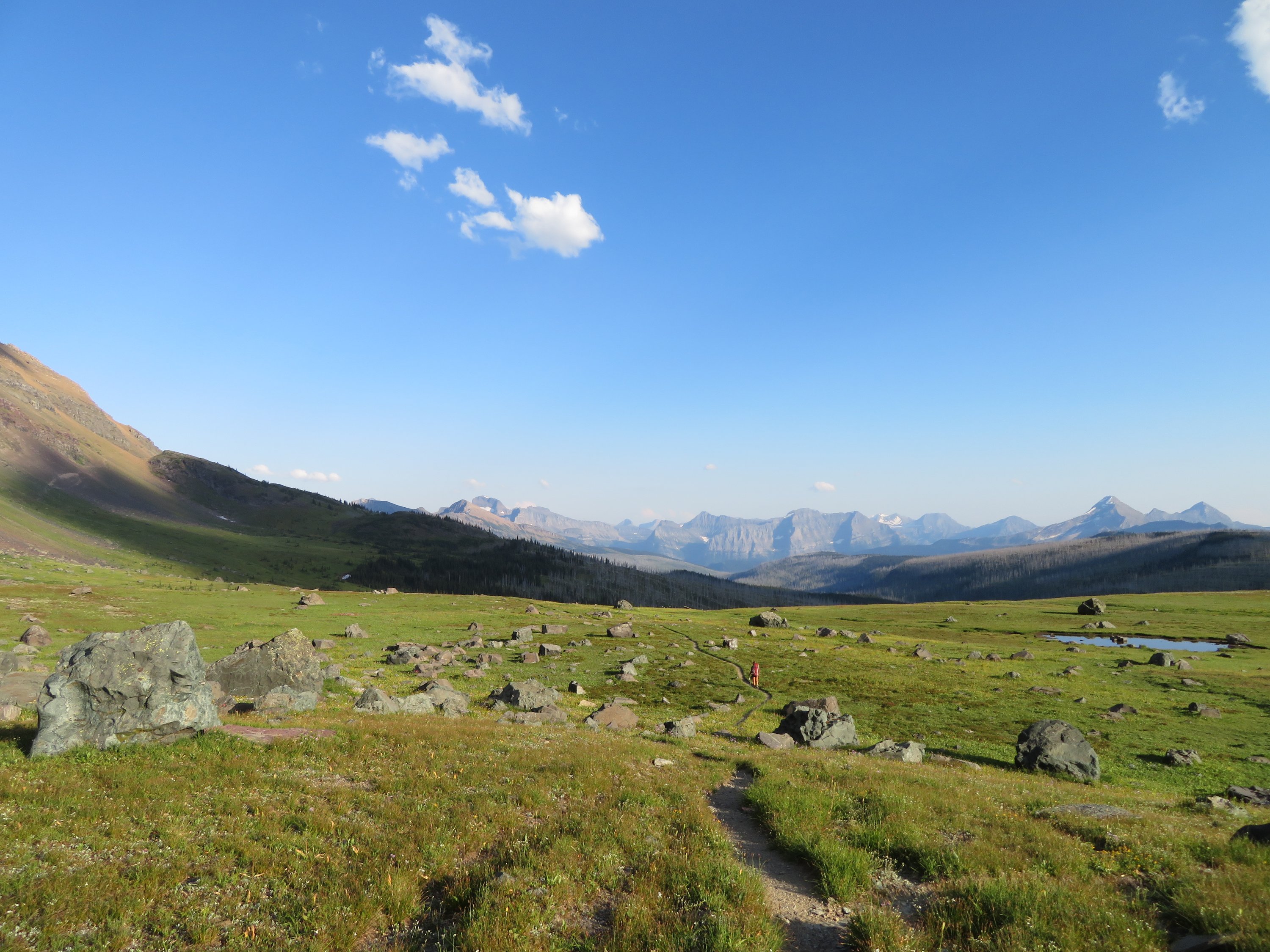 Though the most magical moment for me was when we reached the pass at Fifty Mountain!!! It was already in the evening with the sun low and glowing when we reached the pass. The view was absolutely breathtaking and overwhelming! A wide open plateau with an enormous rock formation towering over us on one side and the view all the way to the horizon with numerous peaks of the park would open up in front of us…probably my favorite moment so far!