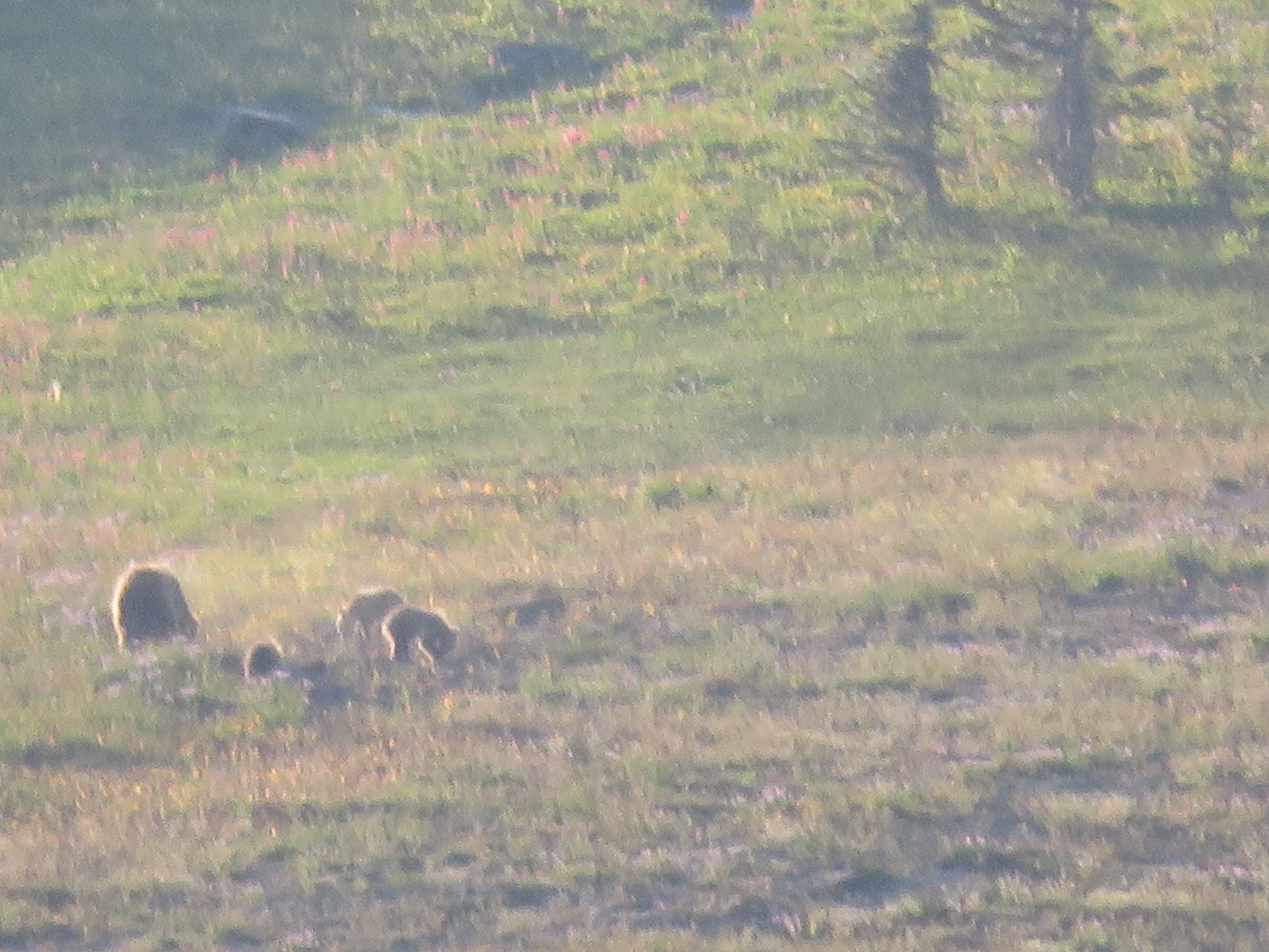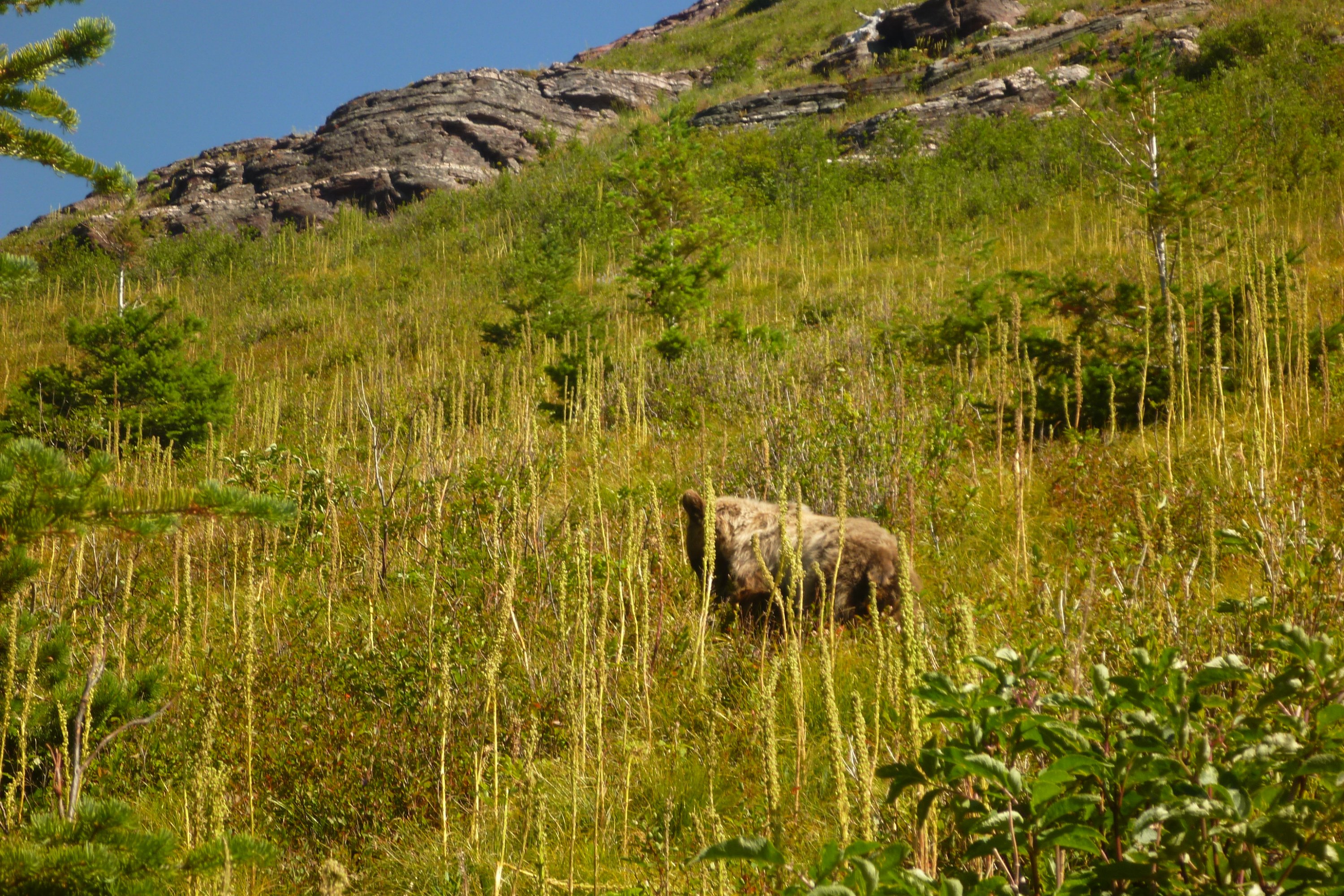 Nachdem wir in den Tetons bezüglich Schutz vor Bären schon um einiges aufgerüstet hatten, haben wir im Sicherheitsvideo im Glacier gelernt, dass Bären nicht so gut hören können. Meine Bärenglocke ist also nicht laut genug. Sollte ich also tatsächlich keine Kuhglocke dabei haben, dann würden die Bären uns nicht gut hören und daher sollten wir durch regelmäßiges klatschen und rufen zusätzlichen Lärm machen, um die Bären nicht zu überraschen und damit aggressives Defensivverhalten hervorzurufen. Oder zumindest da, wo die Vegetation sehr dicht ist, oder vor Kurven oder Pässen, wo wir nicht voraussehen können. Also sind wir gewandert, fröhlich vor uns hin klatschend und rufend, und haben es trotzdem geschafft drei Schwarzbären aus nächster Nähe direkt neben dem Trail zu sehen. Und eine Grizzlybärenmutter mit drei Jungen. Die aber zum Glück nur in der Ferne. Die Schwarzbären waren tatsächlich recht klein. Und völlig unbeeindruckt von uns, obwohl wir nur wenige Meter entfernt waren. So konnten wir sie in Ruhe beobachten und dann einfach an ihnen vorbeigehen. Leider war es trotzdem nicht so einfach gute Bilder von ihnen zu machen. Was übrigens eine interessante Beobachtung war, wenn ich andere Wanderer informiert habe, dass wir einen Bär in der Nähe des Trails gesehen haben. Die Hälfte reagierte aufgeregt und zückte schon die Kamera, die andere Hälfte reagierte verängstigt und hielt das Bärenspray bereit. Wir waren uns den Bären und der potentiellen Gefahr sehr bewusst und hatten daher Glück, dass wir Bären so nah und friedlich sehen konnten. Das rufen hat wohl also geholfen.