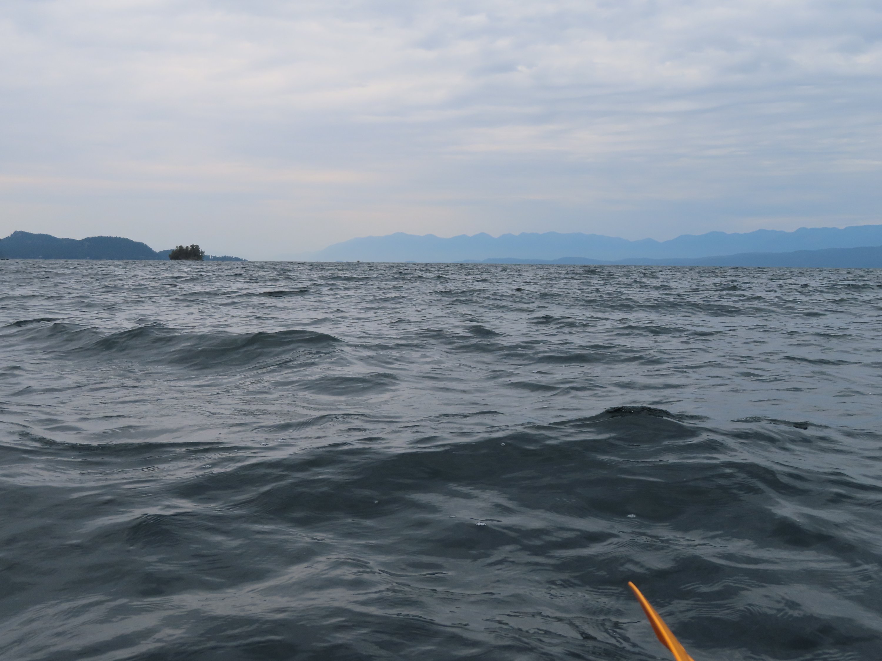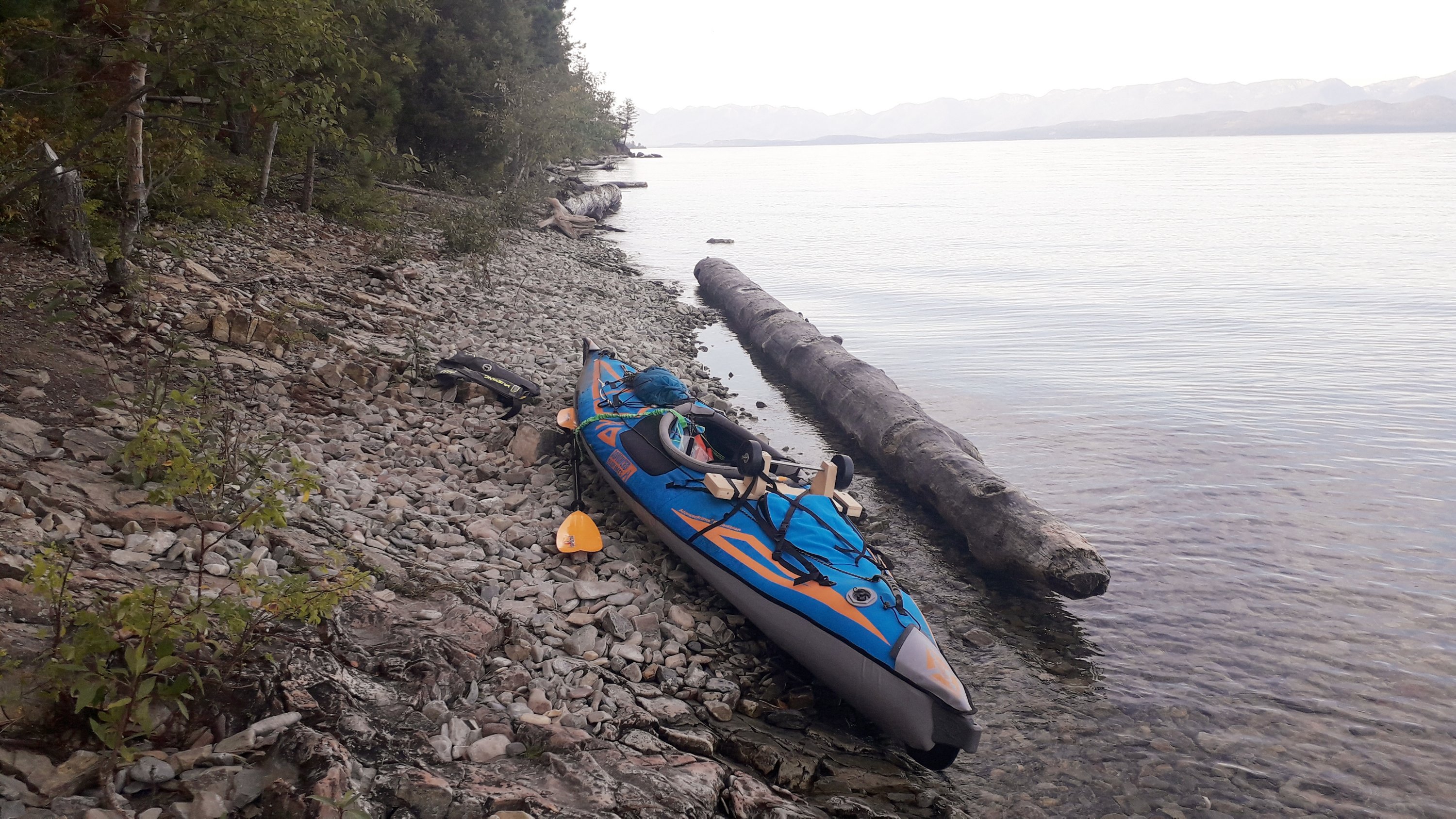 After a couple of days of hard paddling I finally reached the Flathead Lake. The lake is fairly large. One can always see the opposite shore but it feels almost endless when you paddle out onto the lake with a small kayak. As it was a sunny day, close to no waves and little boat traffic I decided that instead of paddling along the shore I would just cut right across. And had to adapt again to new conditions learning about the movement of the water, the wind and the waves when a motor boat would pass. I made good progress but distance can quickly be underestimated. Seeing the shore ahead of you may make you believe that you are almost there. But that can be an illusion. What feels like almost there can be another couple of hours of paddling. As I figured out over the next days. The first day the lake was calm, the day after was the first day that the weather changed to cold and cloudy and with that the water was choppy, as it was on the last day. But even then I was so lucky that the water and waves weren’t too rough and more so that I had the wind mostly behind me. It was an interesting experience navigating the waves and the wind. Understanding again how my boat moves and reacts. And also where my comfort zone was. At what point would the waves be too rough? Not only to understand my capabilities but also knowing and accepting the risks was another lesson I would learn on the lake.