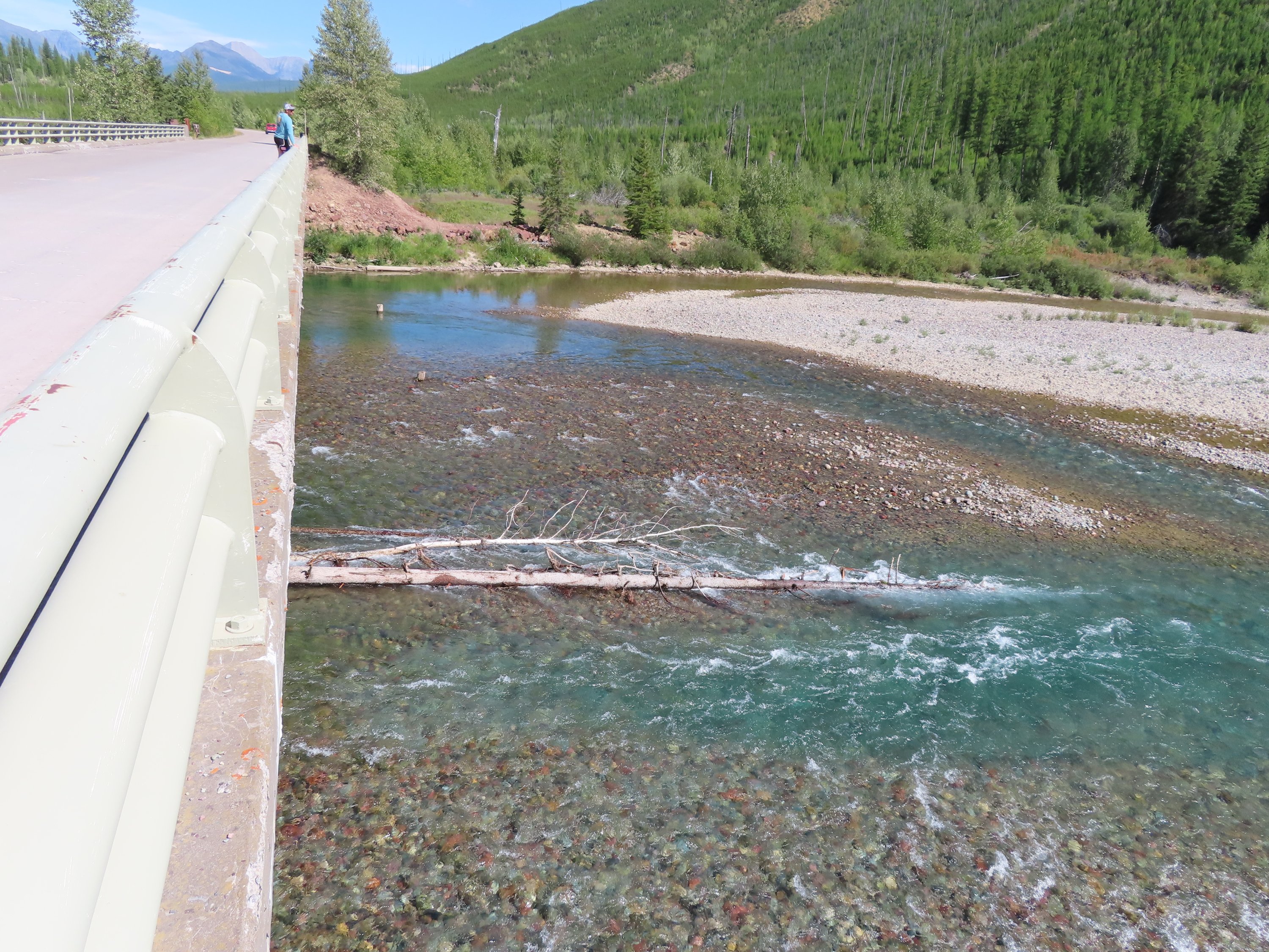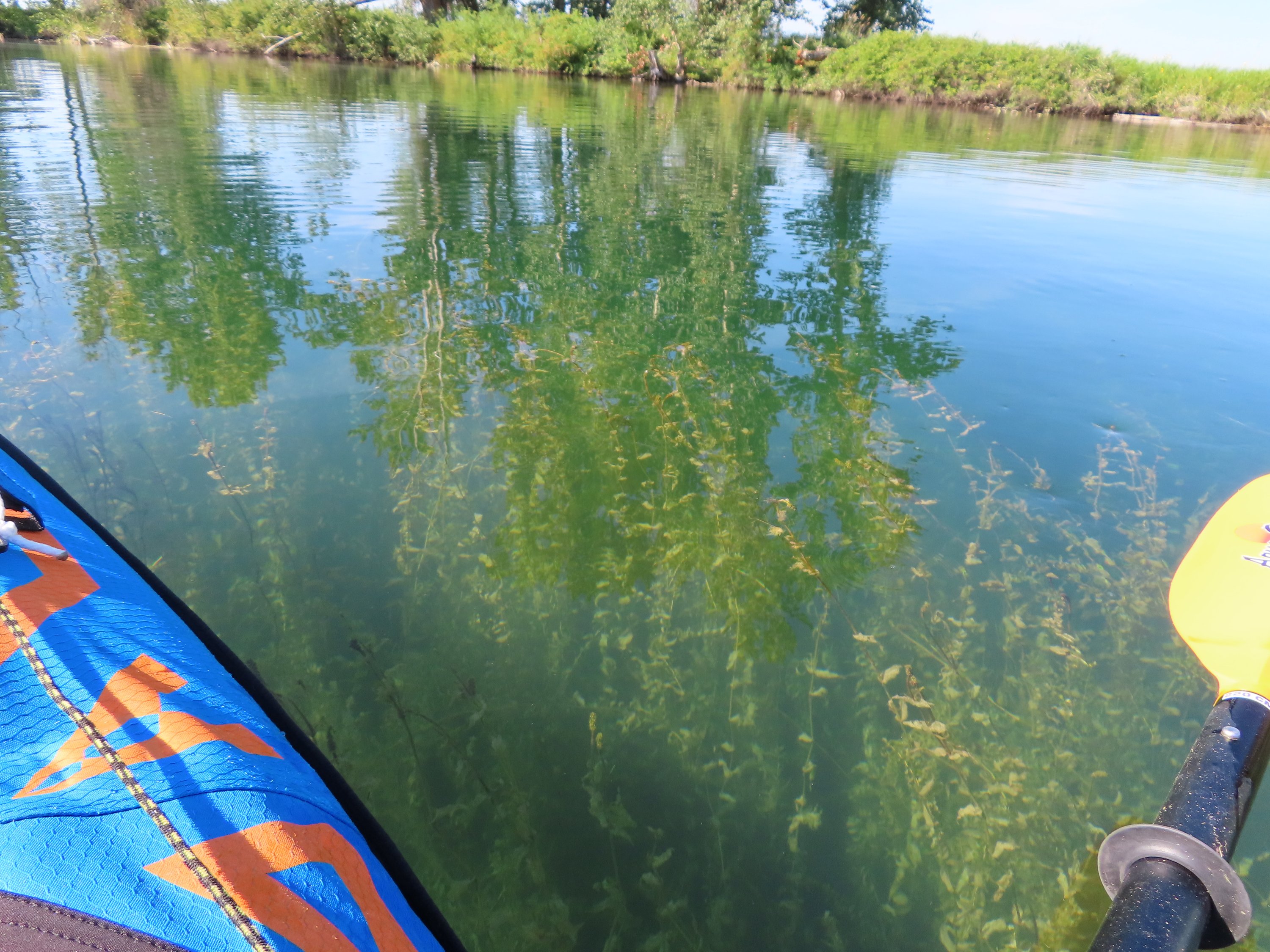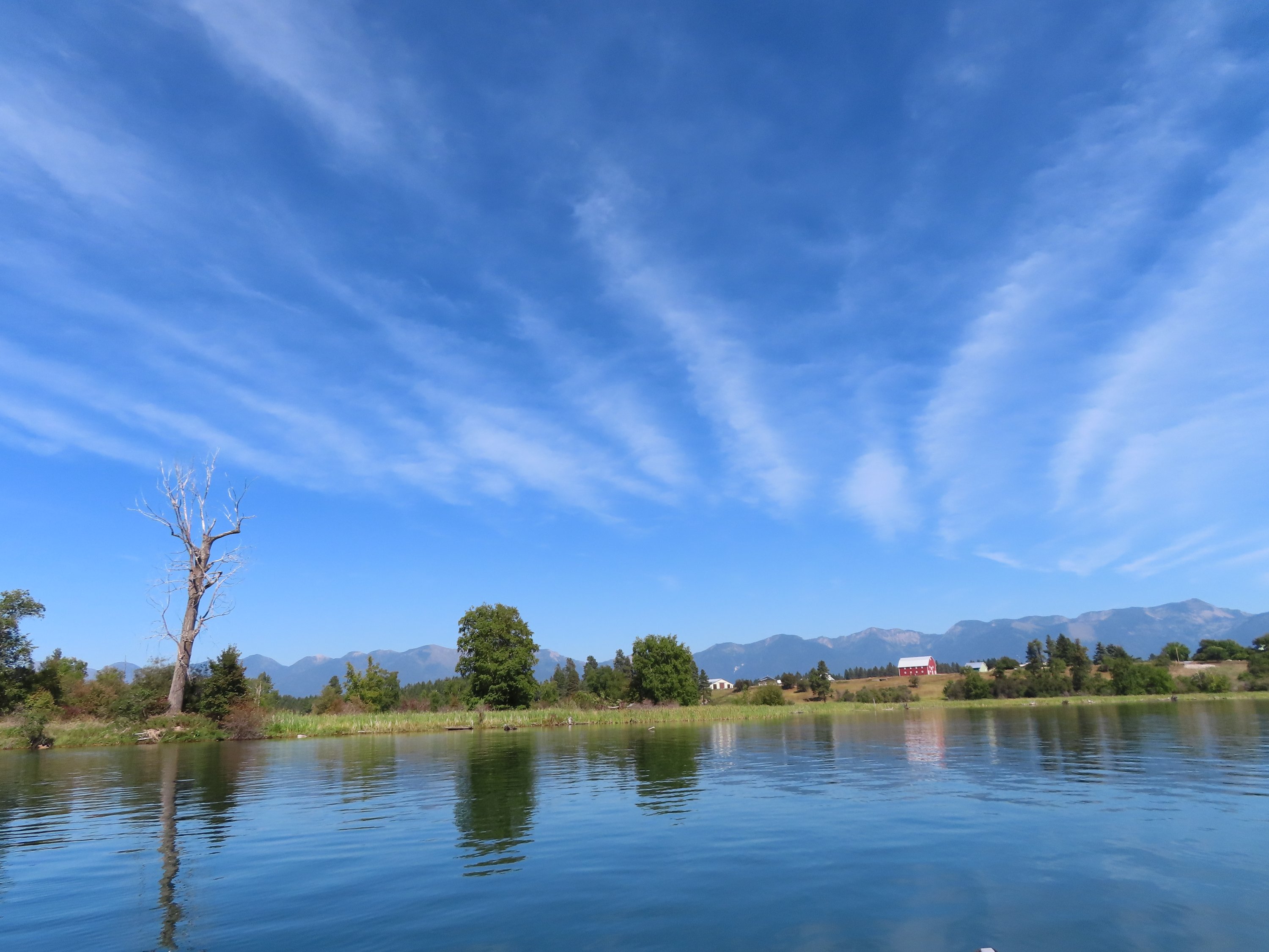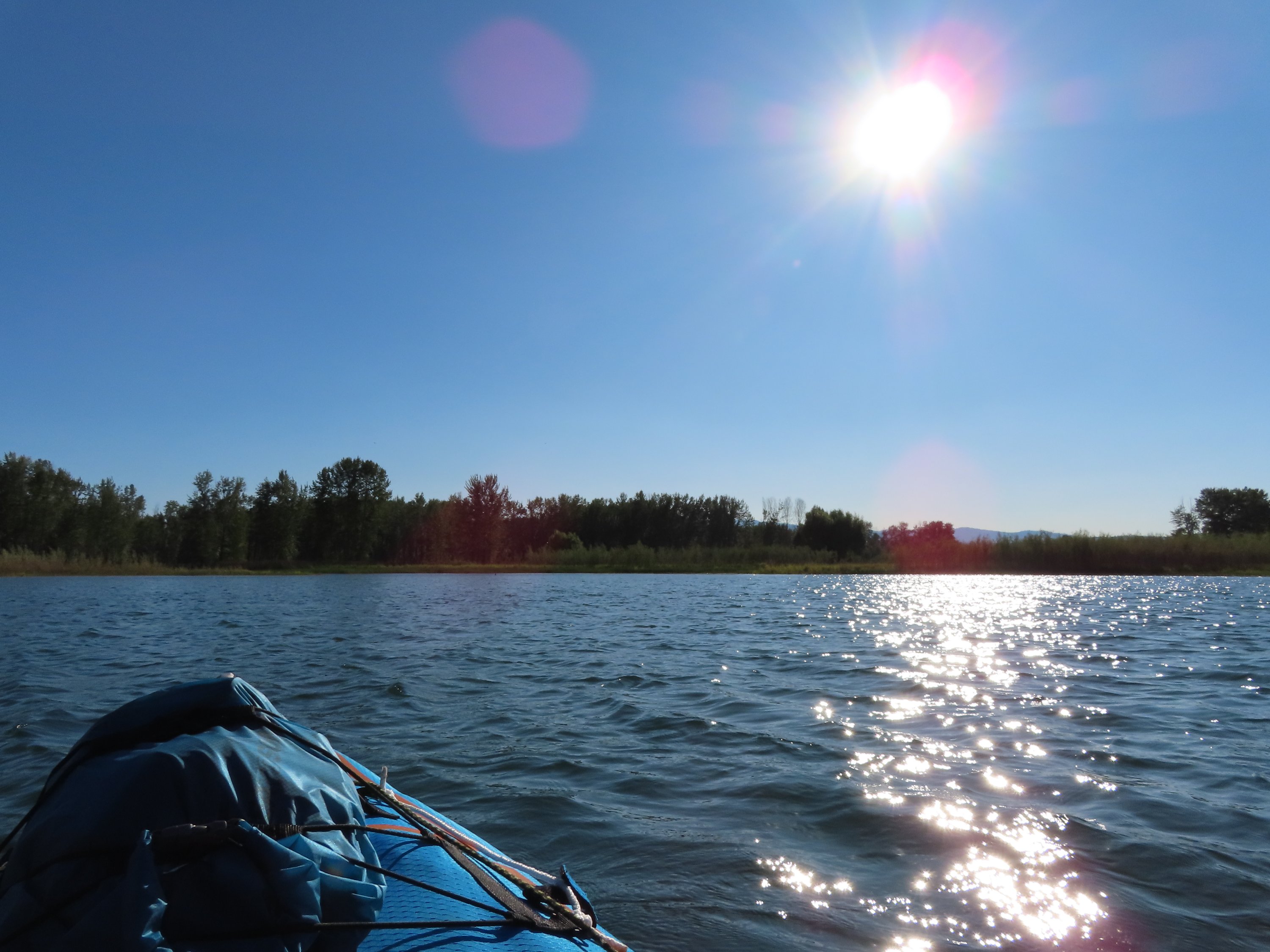 Nachdem ich Columbia Falls erreicht hatte und nach dem Abschnitt, den ich mit Erich auf dem Stand-Up Paddle Board gepaddelt bin (seperater Post), ging es weiter auf dem Flathead River Richtung See. Ab da wurde der Fluss breiter, tiefer und langsamer. Stromschnellen gab es kaum noch. Damit änderte sich aber auch das Paddeln. Ich musste definitiv mehr paddeln, um in Bewegung zu bleiben, da es nicht mehr viel Strömung gab. Vor allem in den breiteren Abschnitten. Je weiter ich den Fluss hinunter paddelte, des mehr veränderte sich auch alles andere. Der Fluss floss durch ein mehr entwickeltes Gebiet. Die Stadt war in der Nähe und ich fuhr hin und wieder an Farmland und Häusern am Fluss vorbei. Aber meistens war es noch Wildnis und wunderschöne Wälder entlang des Flusses. Durch den langsameren Flussverlauf gab es in den Uferböschungen viel mehr wilde Tiere zu beobachten. Und es gab mehrere Abschnitte in denen sich der Fluss Gabelungen verzweigte. Das und die Anpassung an die andersartigen Bedingungen des Flusses bedeuteten, dass es ein anderes, wenn auch genauso aufregendes Erlebnis war, diesen Abschnitt des Flusses hinunter zu paddeln.