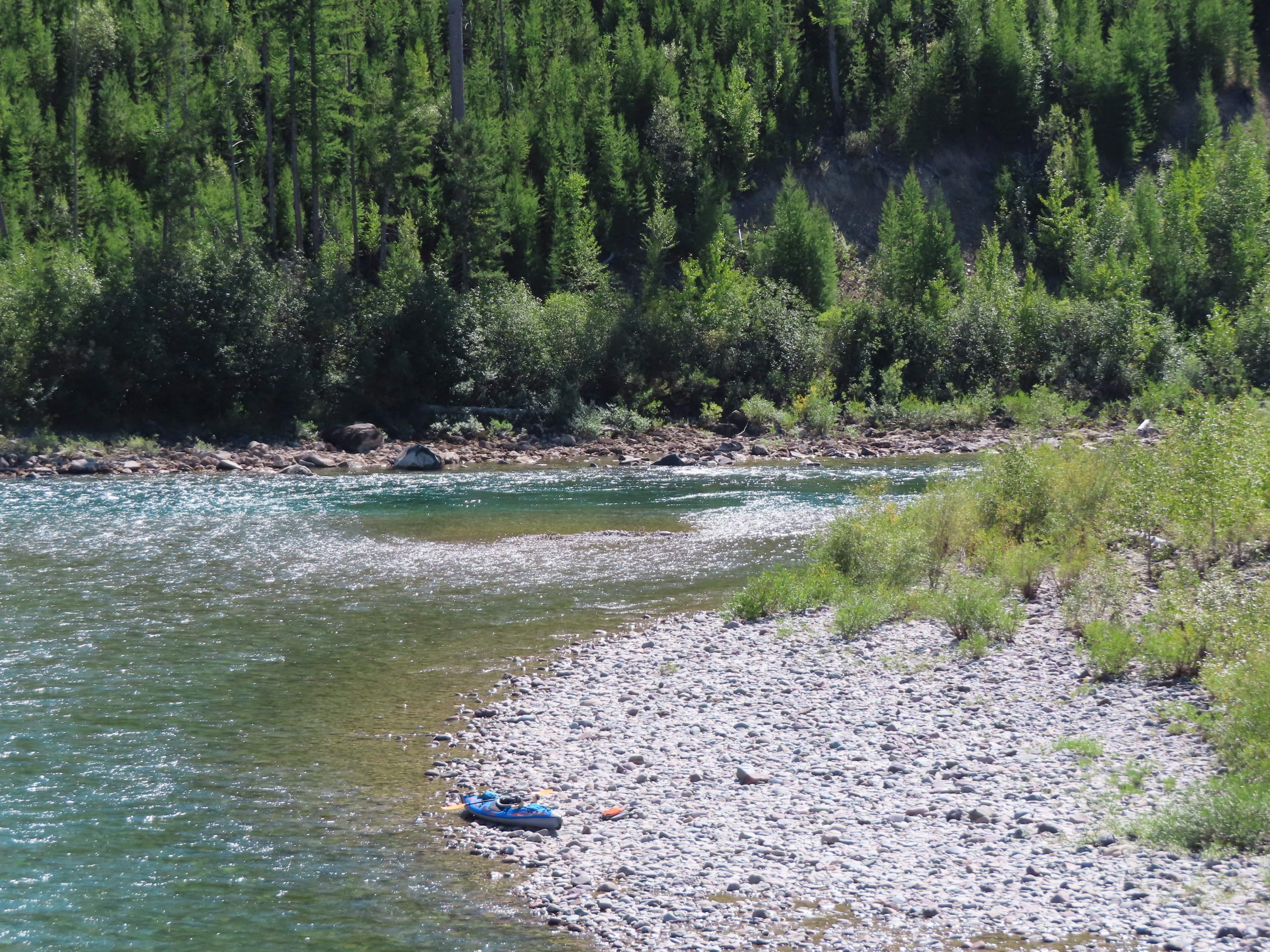 After reaching Columbia Falls and the section I did with Erich on the stand-up paddle board (seperate post), I continued down the Flathead River towards the lake. By then the river had become wider, deeper and slower. There were hardly any more rapids. So the paddling changed. I definitely had to paddle more to keep moving as often there wouldn’t be much current at all. Especially in the wider sections. The further down the river I traveled the more everything else changed as well. The river would flow through a more developed area. The town was close and I would pass farmland and houses by the river every now and then. But mostly it was still wild and beautiful forests along the shores. The slower river meant that the embankments are home to much more wildlife. And there are several sections where the river would branch into forks. That and adapting to the different movement of the river meant that it became a different but just as exciting experience paddling down this section of the river.