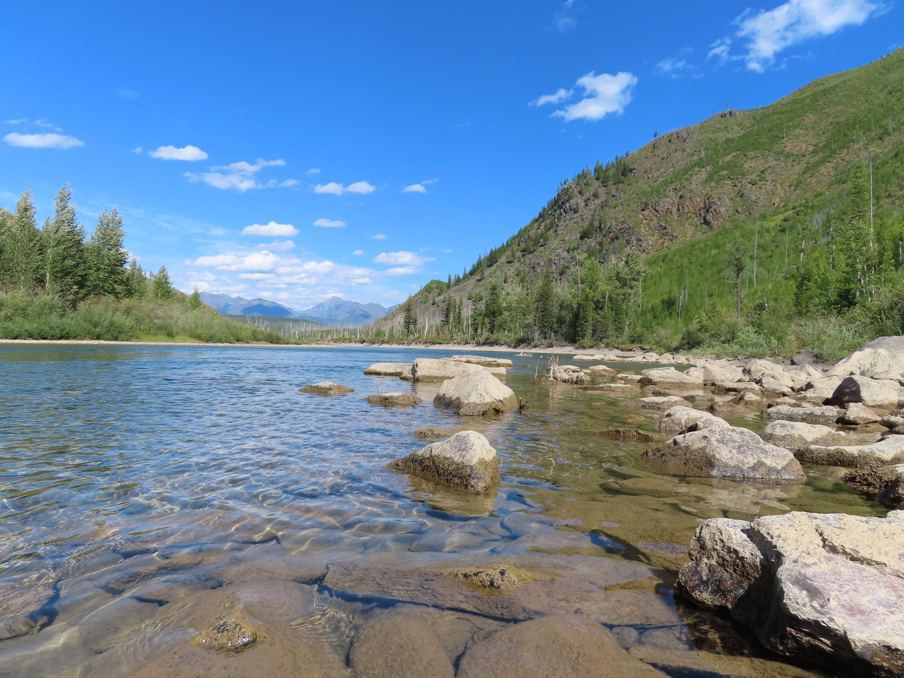 Wenn ich gedacht habe, das eine Wanderung durch das ganze Land ein richtiges Abenteuer ist, dann wurde das mit dem Paddeln durch Montana nochmal auf ein neues Niveau gebracht! Beim Wandern packst du einfach deinen Rucksack, suchst dir einen Trail heraus und machst dich auf den Weg. Natürlich gibt es auch dabei viele Dinge und Risiken zu beachten. Aber seit ich mein Abenteuer auf dem Fluss begonnen habe, musste ich so viele neue Dinge lernen und mich schnell anpassen können. Und es hat mich in so vieler Hinsicht ausserhalb meiner Komfortzone gebracht. Der Splash war nur eine Lektion. Vor allem teuer, aber nicht wirklich mit ernsthaftem Schaden. Dafür eine sehr wertvolle Lehre in Bezug darauf worauf es beim Reisen auf dem Wasser ankommt. Und so konnte ich nach ein paar Tagen, nachdem ich alles ersetzt hatte und Scott mich wieder zurück zur Brücke gebracht hat, weiterpaddeln. Diesmal war absolut alles am Boot gesichert. Und ich war mir des Flusses, der Strömung, der Stromschnellen, der Wellen und der flachen Stellen noch bewusster. Das Wetter war weiterhin einfach perfekt. Blauer Himmel und Sonnenschein. Ich freute mich nicht nur wieder auf dem Fluss zu sein, sondern war auch dankbar, dass ich diese atemberaubende Wildnis erleben durfte!