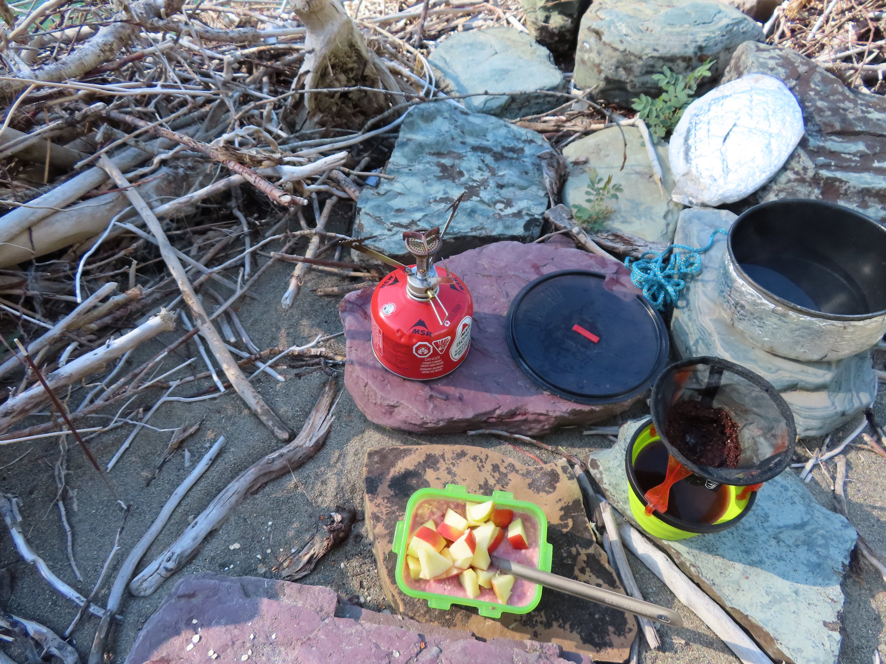 Am nächsten Tag startete ich voller neuer Energie und Entschlossenheit es den Fluss hinunter zu schaffen. Ich habe das Boot nochmal ordentlich aufgepumpt. Alles gesichert. Und mich auf den Weg gemacht. Ich hatte es bereits ohne Probleme durch einige Stromschnellen geschafft, als ich auf eine weitere zusteuerte. Es sah überschaubar als, also beschloss ich es zu versuchen. Aber als ich hineinpaddelte, lief ich im seichten Wasser auf einen Stein auf. Und steckte fest. Ich konnte mich nicht freiruckeln, also stieg ich schliesslich aus. Ich versuchte durch den Fluss zum Ufer zu laufen, um das Boot durch die Stromschnelle zu ziehen. Da ich teilweise durch die Strömung waten musste, versuchte ich nicht den Halt zu verlieren und gleichzeitig das Boot unter Kontrolle zu halten. Aber es stieß gegen einen anderen Stein und kippte um. Und wieder wurde alles durchnässt. Aber ich schaffte es das Boot zurückzudrehen und es durch die Stromschnelle und auf das Ufer dahinter zu ziehen. Wo ich alles zum trocknen auslegte. Mal wieder.
