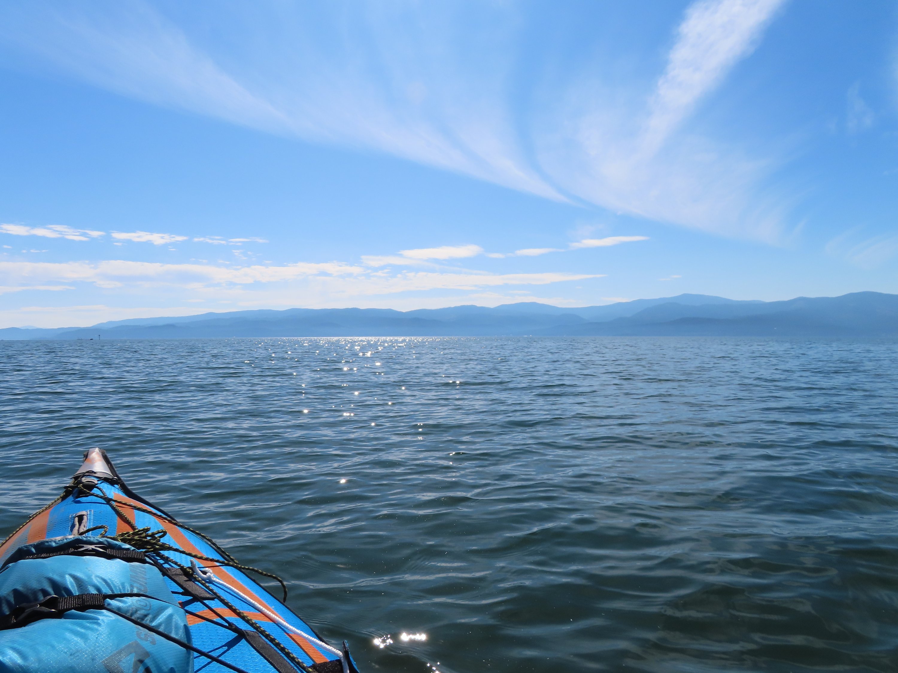 Nach ein paar Tagen intensiven Paddelns erreichte ich dann endlich den Flathead Lake. Der See ist ziemlich groß. Man kann immer das gegenüberliegende Ufer sehen, aber es fühlt sich fast endlos an, wenn man mit seinem kleinen Kajak über den See paddelt. Da es ein sonniger Tag war, nahezu keine Wellen und wenig Bootsverkehr, beschloss ich, dass ich anstatt am Ufer entlang einfach quer über den See paddeln würde. Und musste mich wieder an neue Bedingungen, wie die Bewegung des Wasser, des Windes und der Wellen, wenn ein Motorboot vorbeifuhr, anpassen. Ich bin gut vorangekommen, aber die Distanz kann man wirklich schnell unterschätzen. Wenn man das Ufer vor sich sieht, denkt man, dass man fast da ist. Aber das kann eine Illusion sein. Was sich so anfühlt wie fast da, kann sich noch um ein paar Stunden handeln. Wie ich in den nächsten Tagen lernen musste. Am ersten Tag war der See ruhig, am darauffolgenden Tag wechselte das Wetter und es war kalt und bewölkt und das Wasser unruhig. Genauso wie am letzten Tag. Aber selbst dann hatte ich so viel Glück, dass das Wasser und die Wellen nicht zu heftig waren und noch viel mehr, dass der Wind meistens von hinten kam. Es war wieder eine sehr spannende Erfahrung durch die Wellen und den Wind zu navigieren. Und wieder zu lernen, wie sich mein Boot verhält und reagiert. Und auch wo meine Komfortzone war. Ab wann sind die Wellen zu heftig? Nicht nur meine Fähigkeiten zu verstehen lernen, sondern auch die Risiken zu erkennen und zu akzeptieren, war eine weitere Lektion, die ich auf dem See gelernt habe.