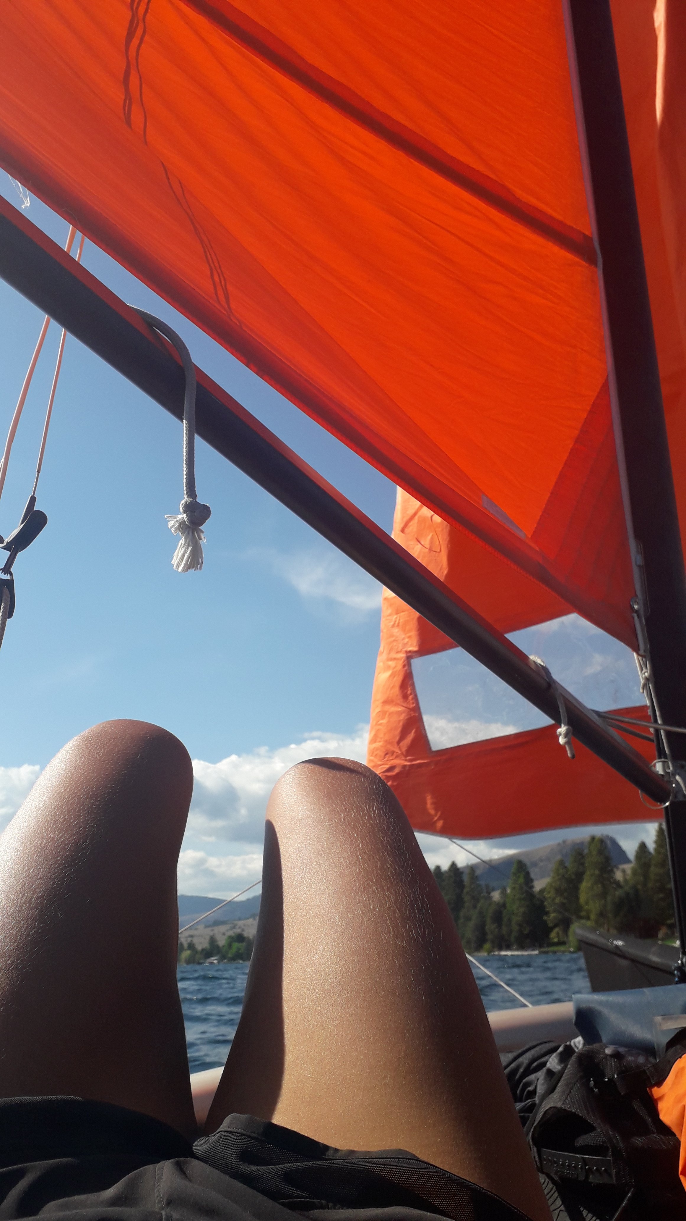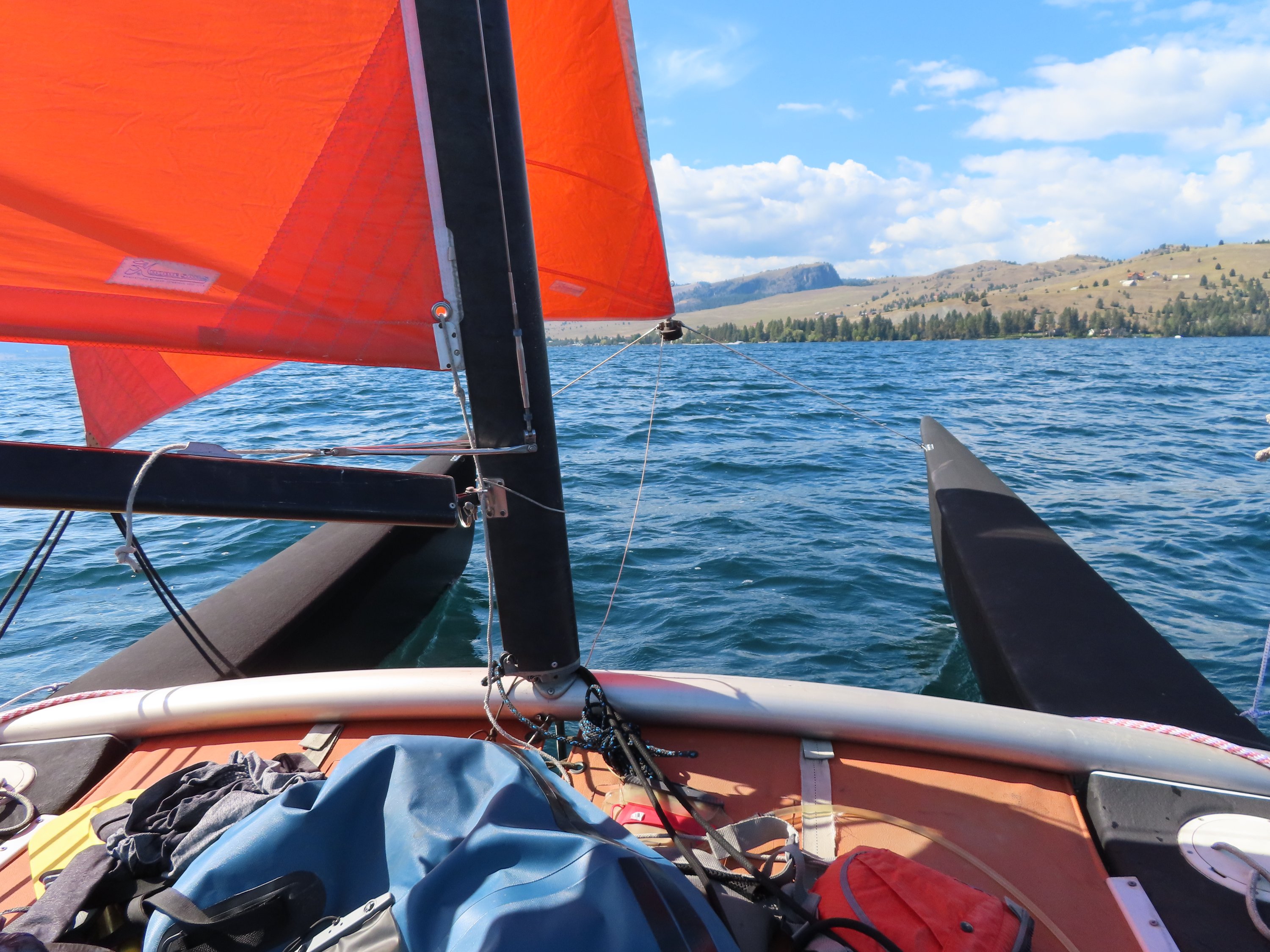 Being on the river with Erich for my first stand-up paddle session I learnt so much about the water and paddling. He also told me about surfing and sailing and what he has learned from that. Neither of which I had done before. So Erich invited me to join him for a day of sailing on the Flathead Lake. What a great opportunity. I went back on the river to continue my route down the Flathead River and then across the Flathead Lake where I met Erich almost at the south end of the Lake in Elmo. He owns a small catamaran. Which was perfect for my first lesson. I learned how to set up the boat and once we got out on the water the basics of sailing. I probably forgot most of the terminology by now. And still don’t know how to do knots. But getting a feeling for the wind, reading the water and learning the main manouvers was not only a great introduction. But it generally helps me understand moving on water better. I could tell the next day when I got back out on the lake to finish my last section in the kayak.