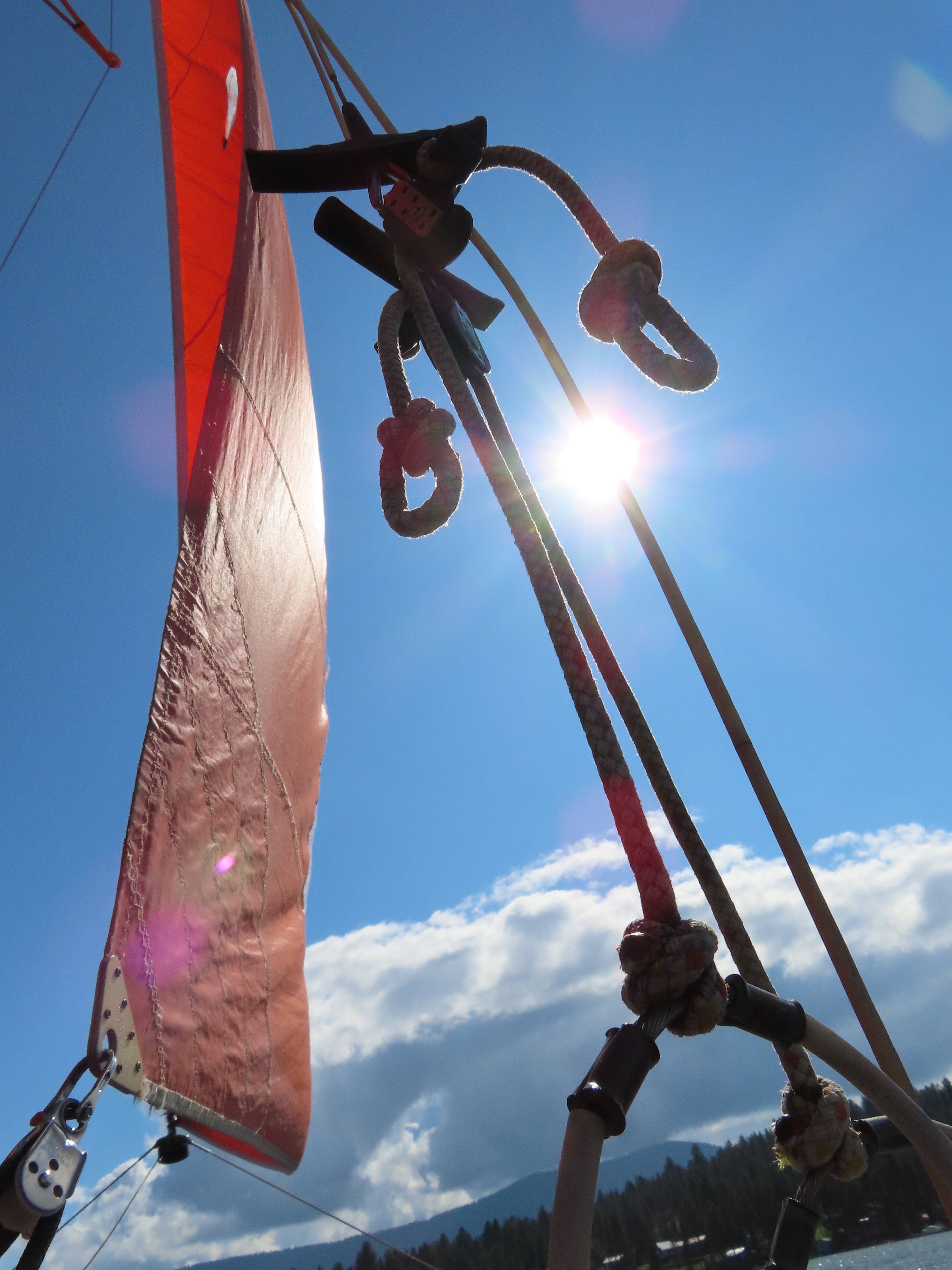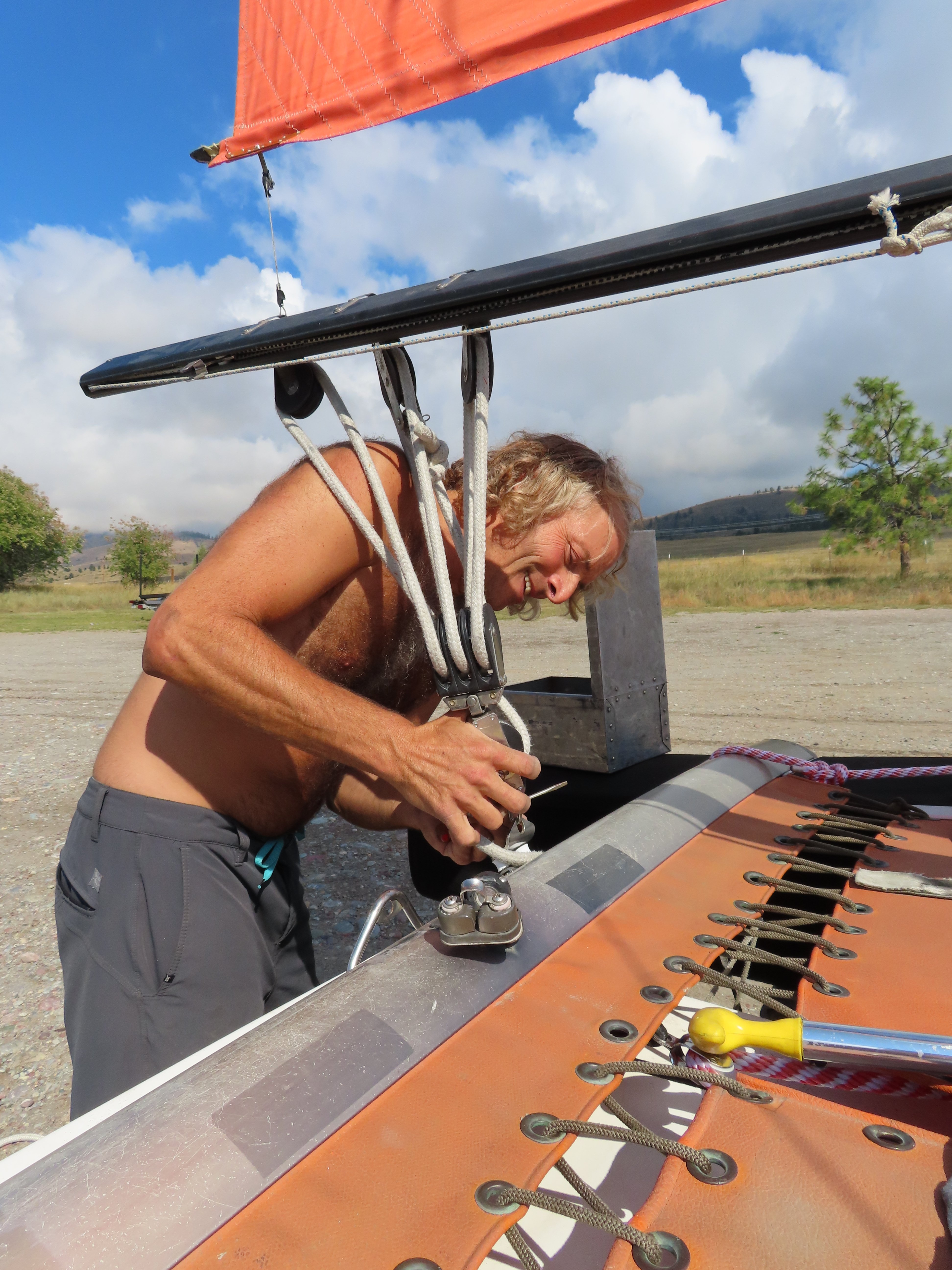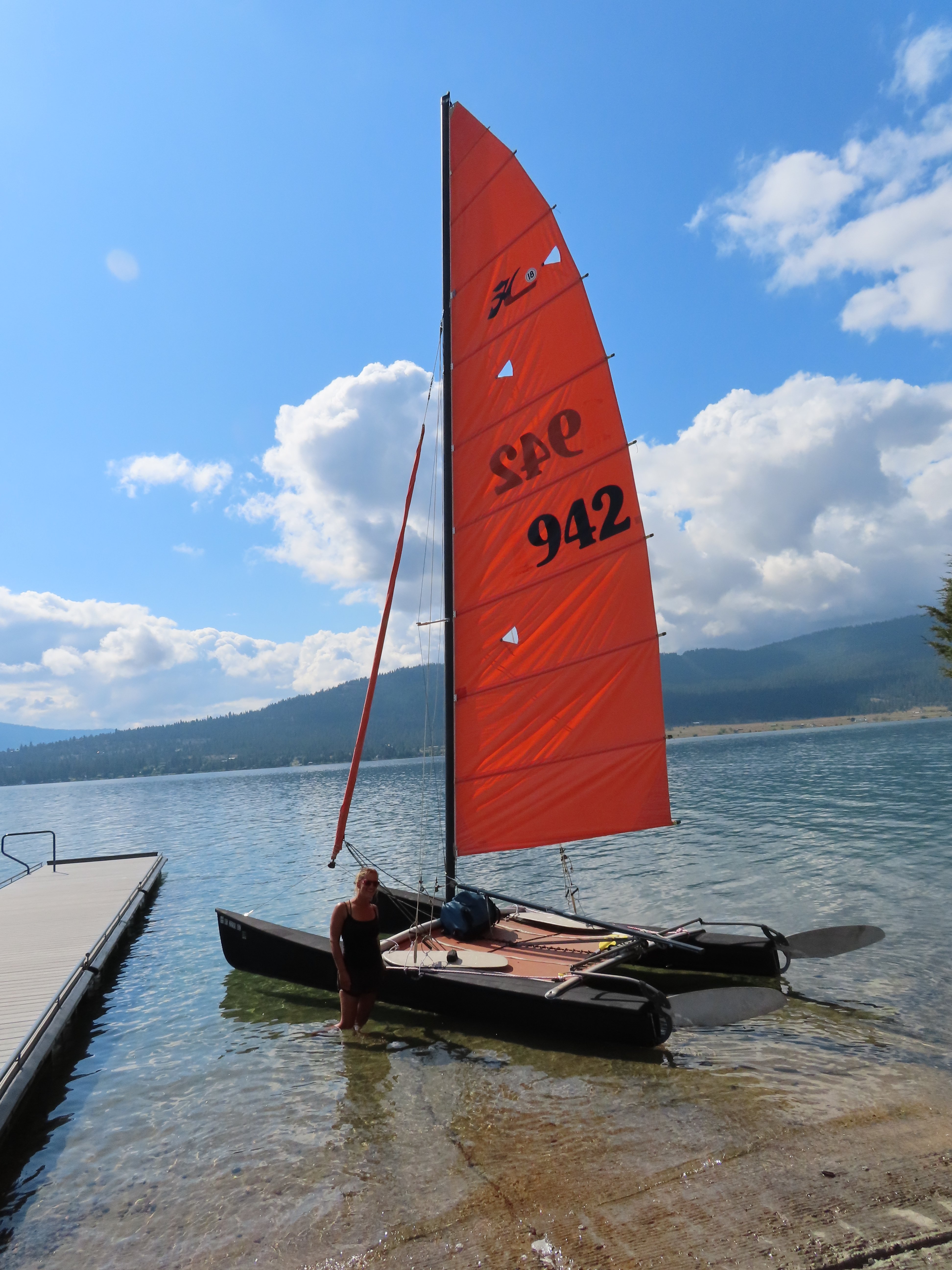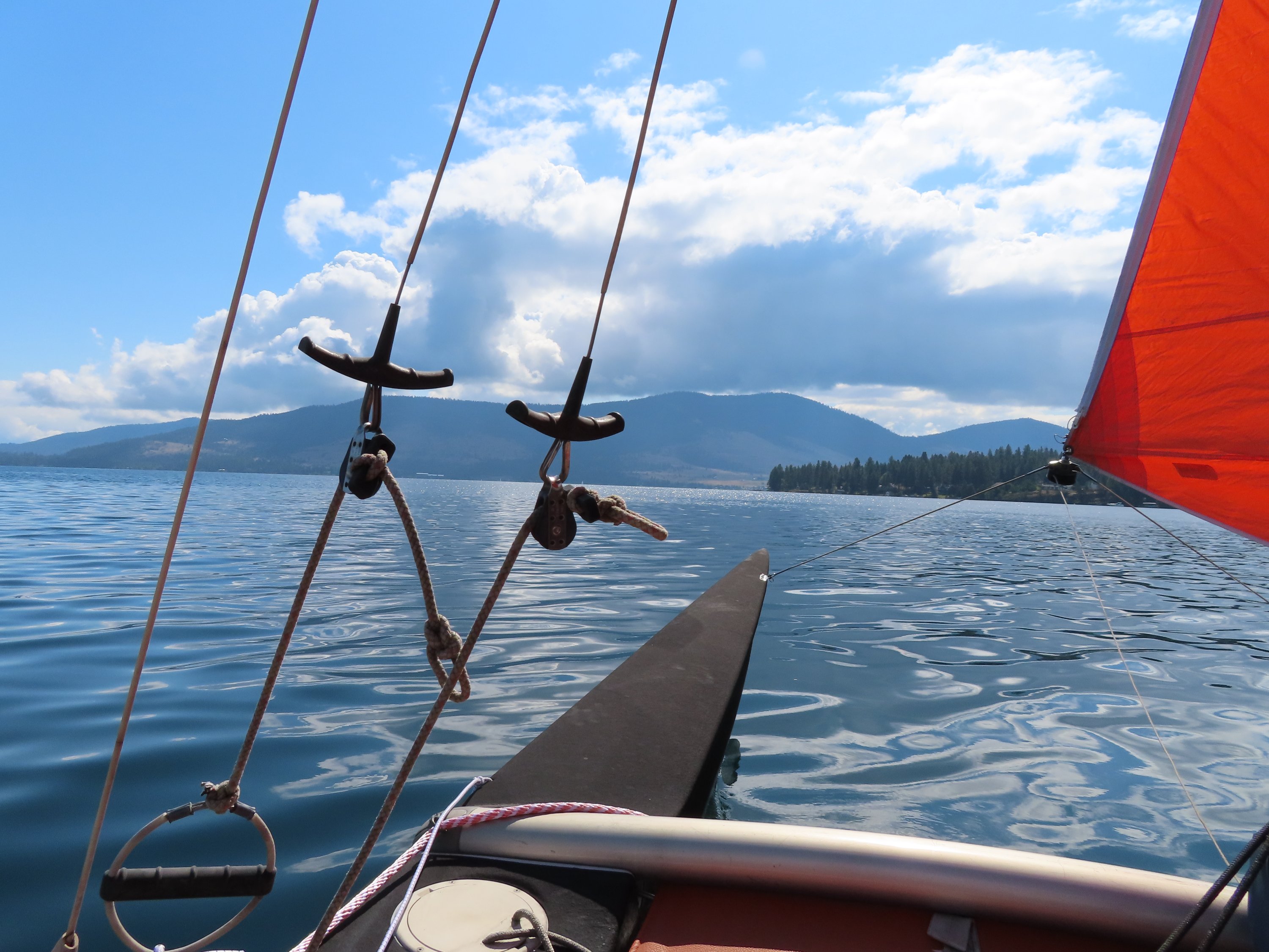 Als ich mit Erich mit dem Stand-up Paddle Board zusammen auf dem Fluss war, lernte ich soviel über das Wasser und das Paddeln. Er erzählte mir dabei auch vom Surfen und Segeln und was er dadurch gelernt hat. Beides hatte ich noch nie gemacht. Also lud mich Erich ein mit ihm einen Tag auf dem Flathead Lake segeln zu gehen. Was für eine großartige Gelegenheit. Ich bin dann erstmal auf den Fluss zurück, um meine Route auf dem Flathead River und dann über den Flathead Lake fortzusetzen, wo ich mich dann mit Erich fast am südlichen Ende des Sees getroffen habe. Er besitzt einen kleinen Katamaran. Welcher für meine erste Segelstunde perfekt war. Ich lernte das Boot aufzubauen und als wir dann auf dem Wasser waren die Grundlagen des Segelns. Den größten Teil der Begrifflichkeiten habe ich inzwischen wahrscheinlich schon wieder vergessen. Und kann immer noch keine Knoten. Aber ein Gefühl für den Wind zu bekommen, das Wasser zu lesen und die wichtigsten Manöver zu lernen, war nicht nur eine großartige Einführung. Sondern hilft mir im allgemeinen die Fortbewegung auf dem Wasser besser zu verstehen. Was ich dann gleich am nächsten Tag spüren konnte als ich wieder auf dem See war, um den letzten Abschnitt mit dem Kajak zu beenden.