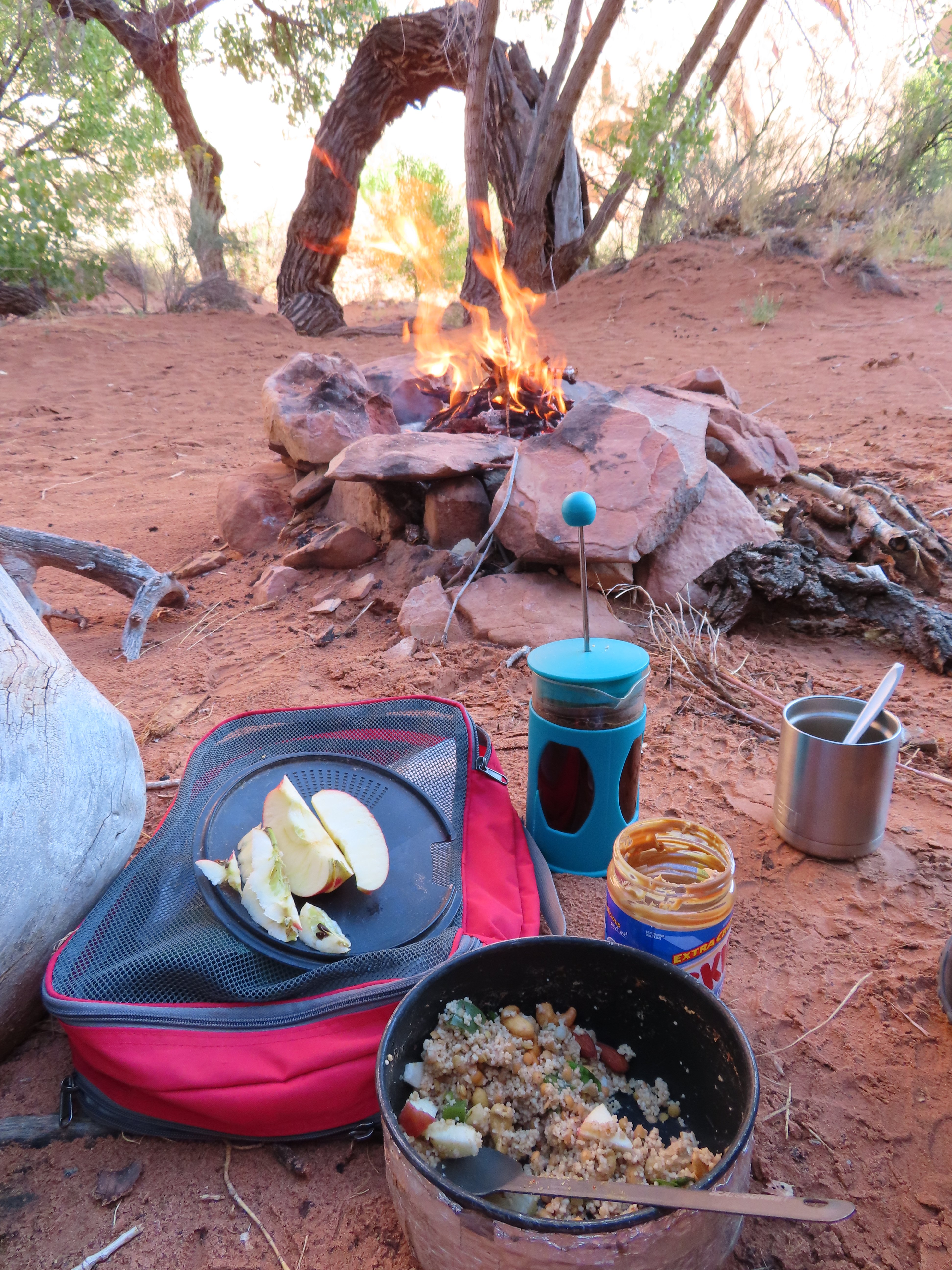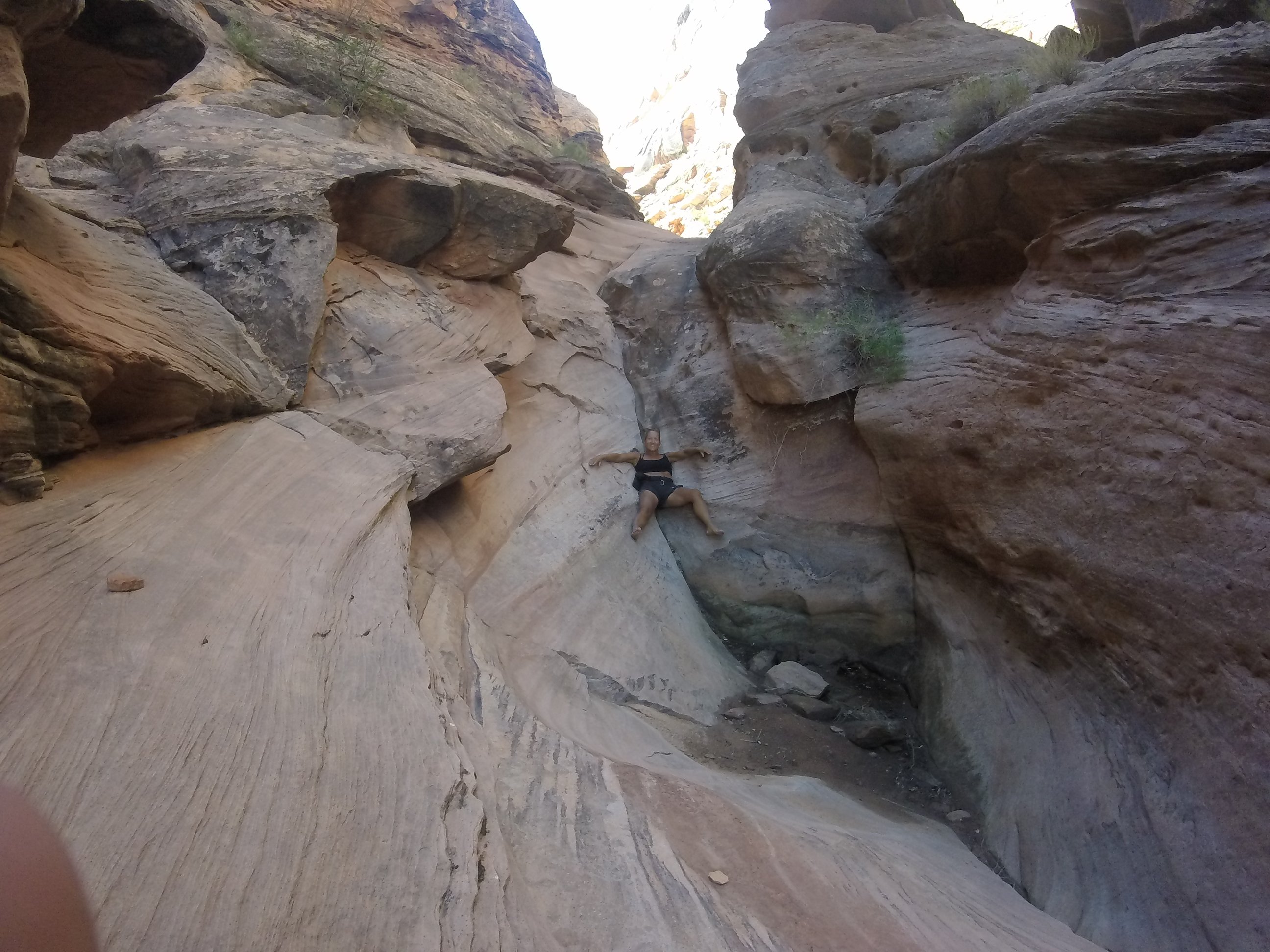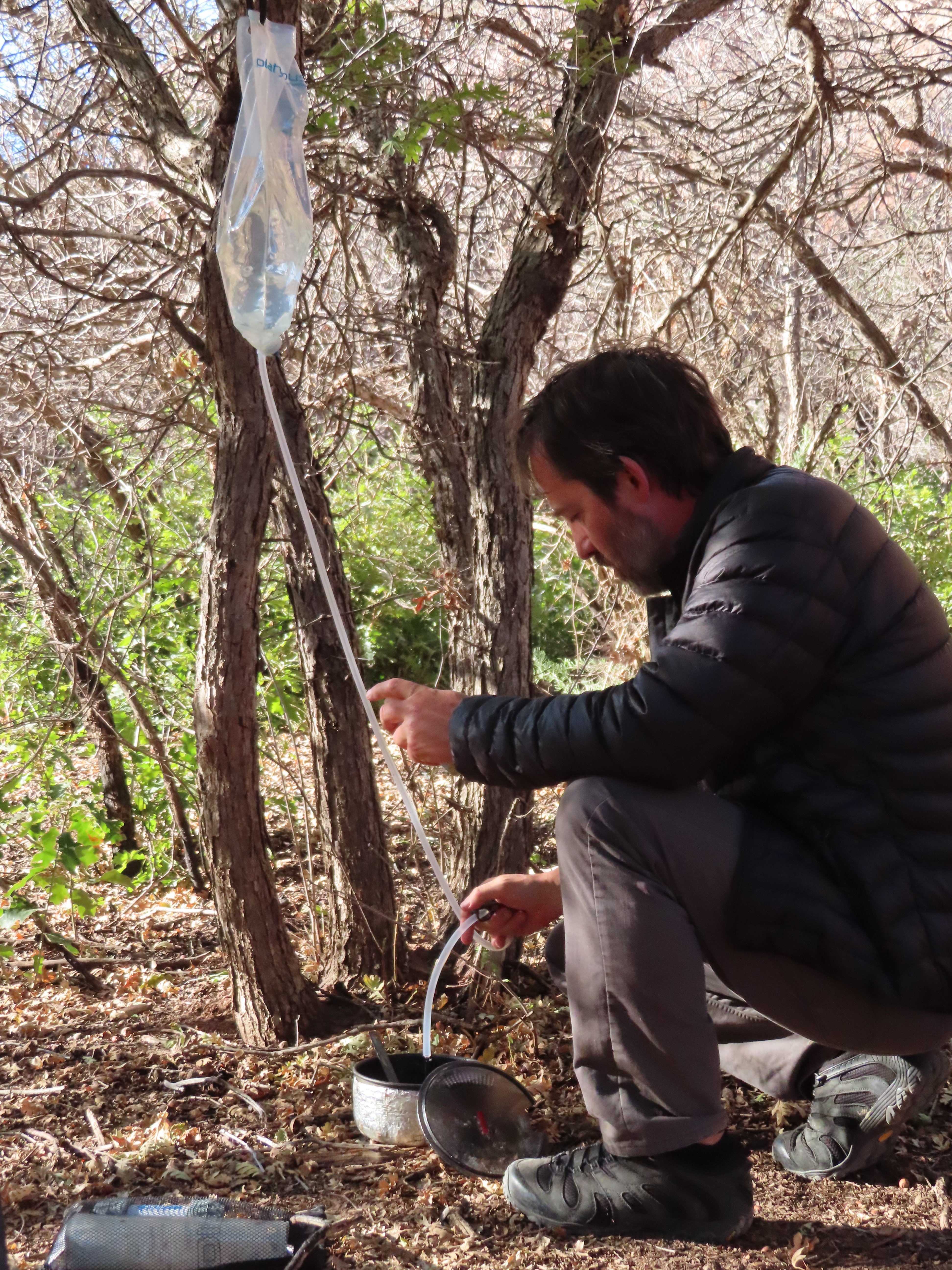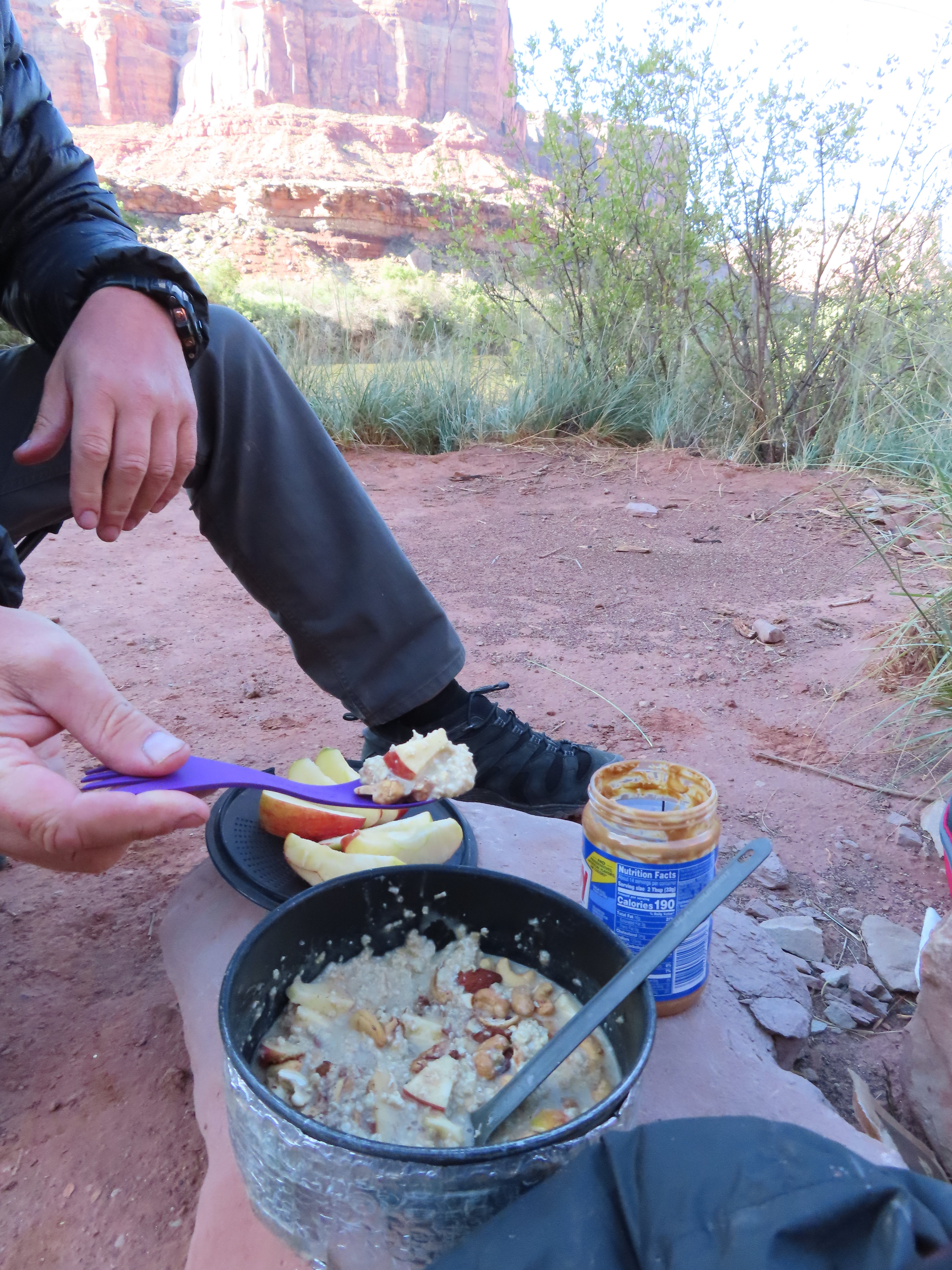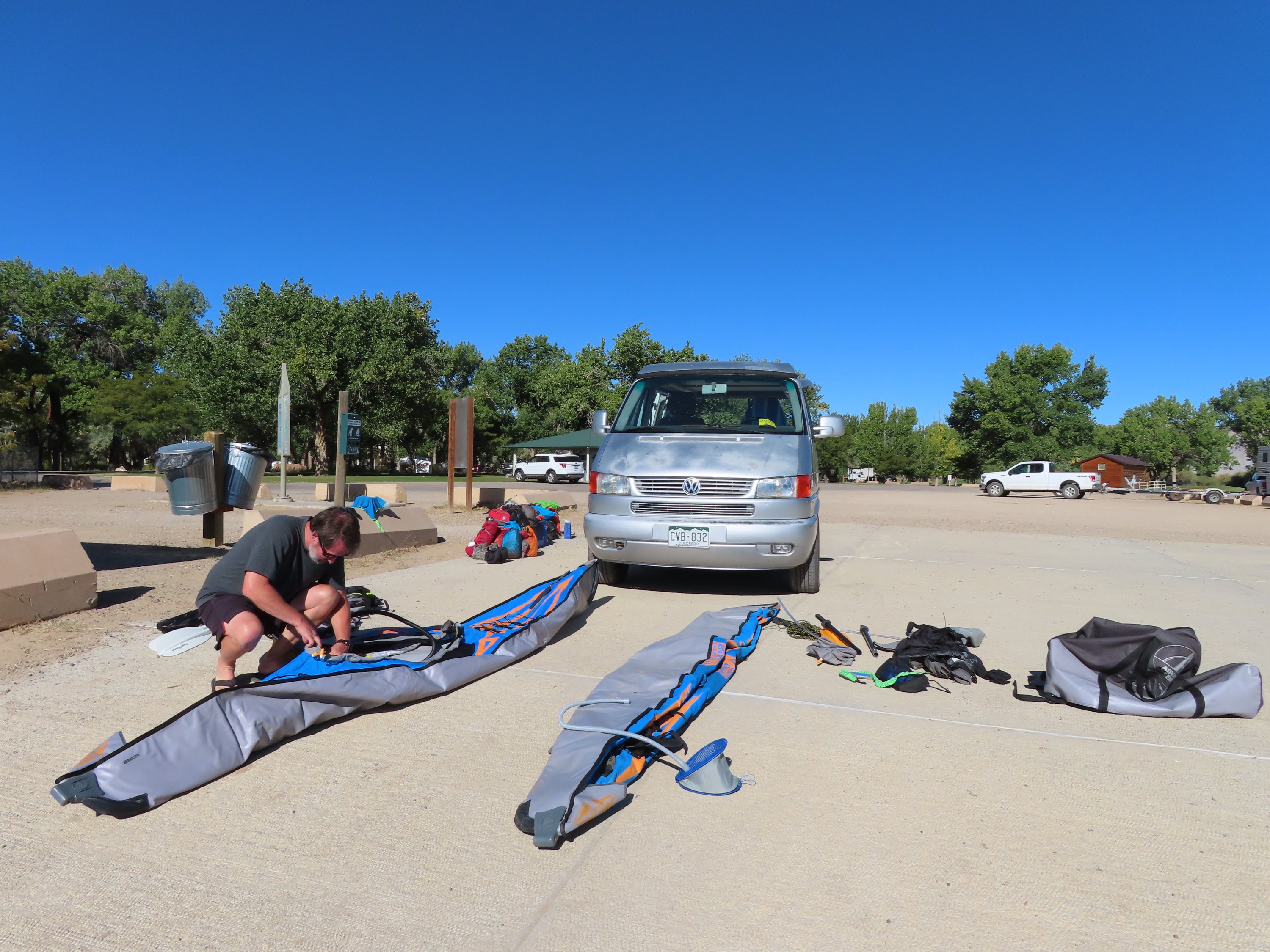 Damit wir von der Zeit flexibel waren und um ein paar hundert Dollar zu sparen, haben wir zunächst das Motorrad zum Takeout am Mineral Bottom gebracht. Die 61 Meilen lange Rückfahrt durchs Gelände nach Green River Town, um den Van zu holen, hätte zwei Stunden dauern sollen, wofür eine Gallone Reservekraftstoff auf dem Sozius befestigt war. Nachdem sich Dan aber aufgrund nicht vorhandener Ausschilderung und der vielen Kreuzungen im Hinterland verirrt hatte, ging der Kraftstoff bereits nach 32 Meilen zur Neige. Der Reservekraftstoff wurde dann eingefüllt mit dem Plan es so weit wie möglich zu schaffen. Mit den zur Vorsicht geladenen Offline Google Maps hat Dan seine Position dann wieder gefunden, aber erst nachdem er über ein paar krasse Jeeppisten gefahren war und nach einem kleinen Sturz. Die zweistündige 61 Meilenfahrt hatte sich somit in eine vierstündige 72 Meilenfahrt verwandelt bevor er den Van geholt hatte und es dann noch rechtzeitig vor Sonnenuntergang zum Takeout zurückgeschafft hatte. Weitere Lektionen gelernt?