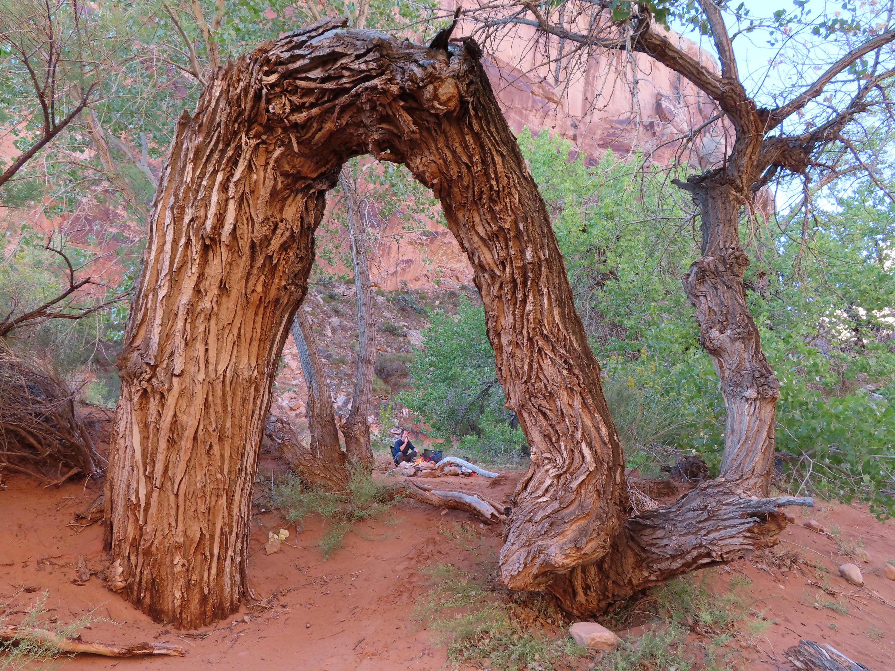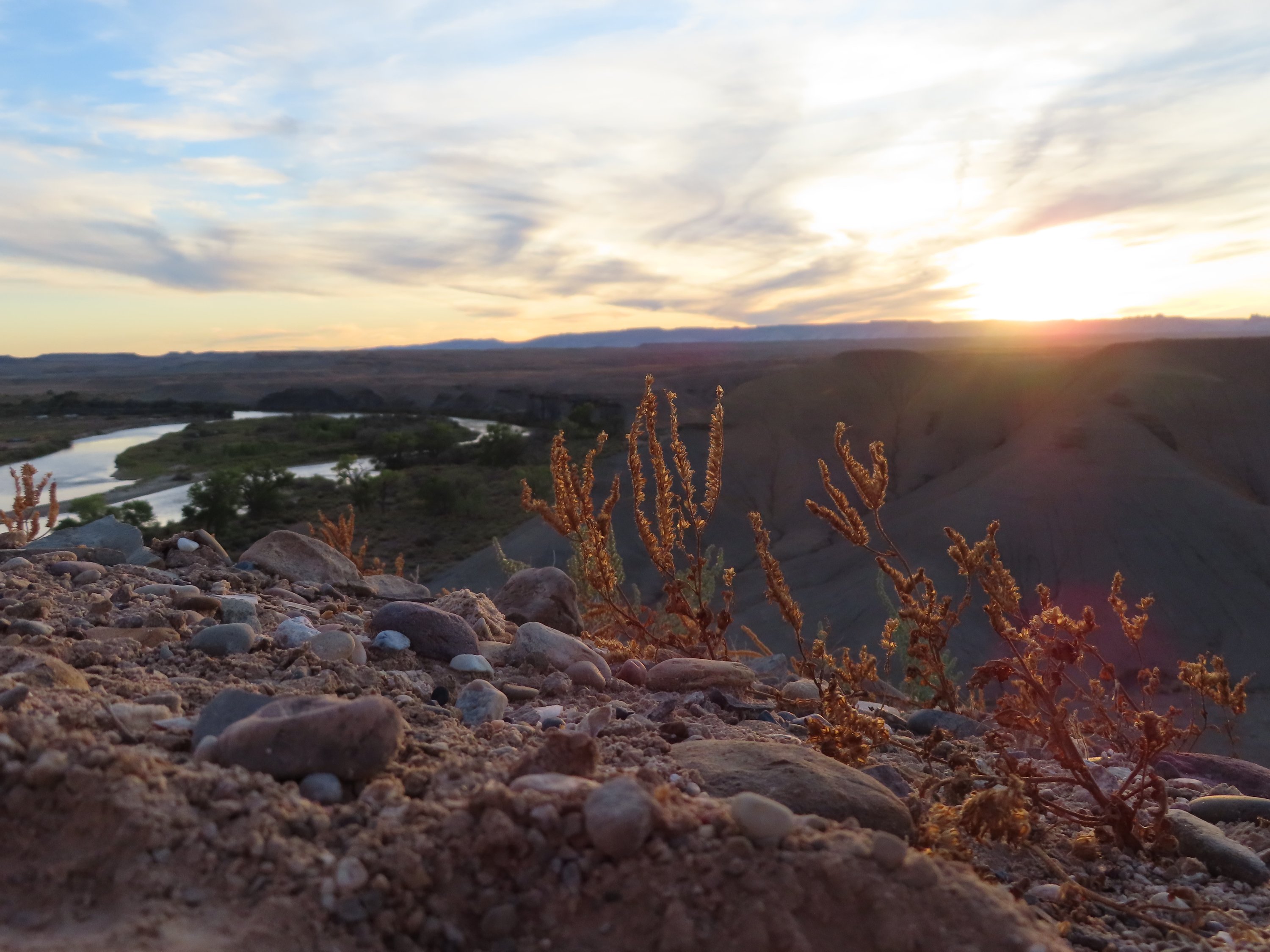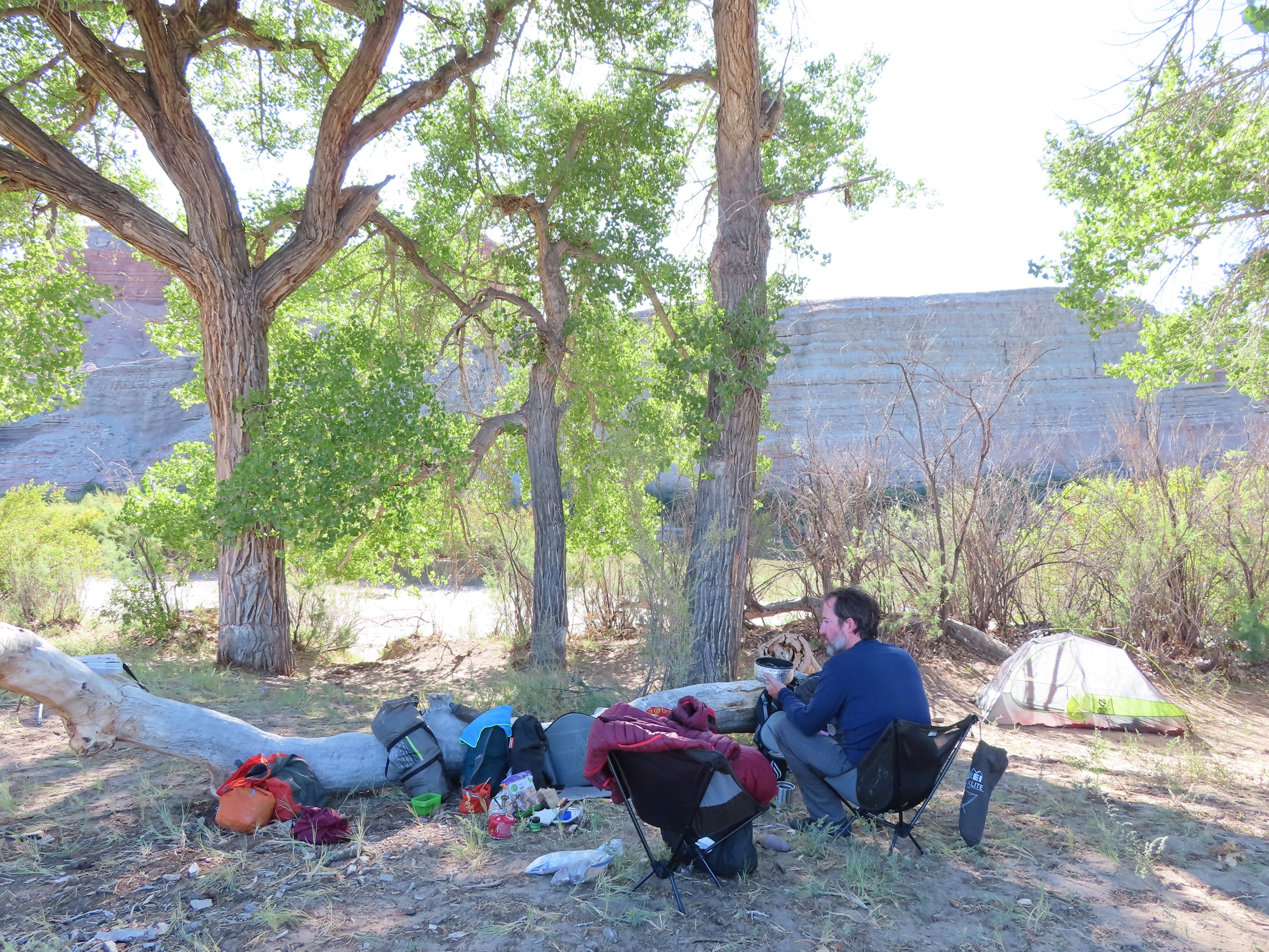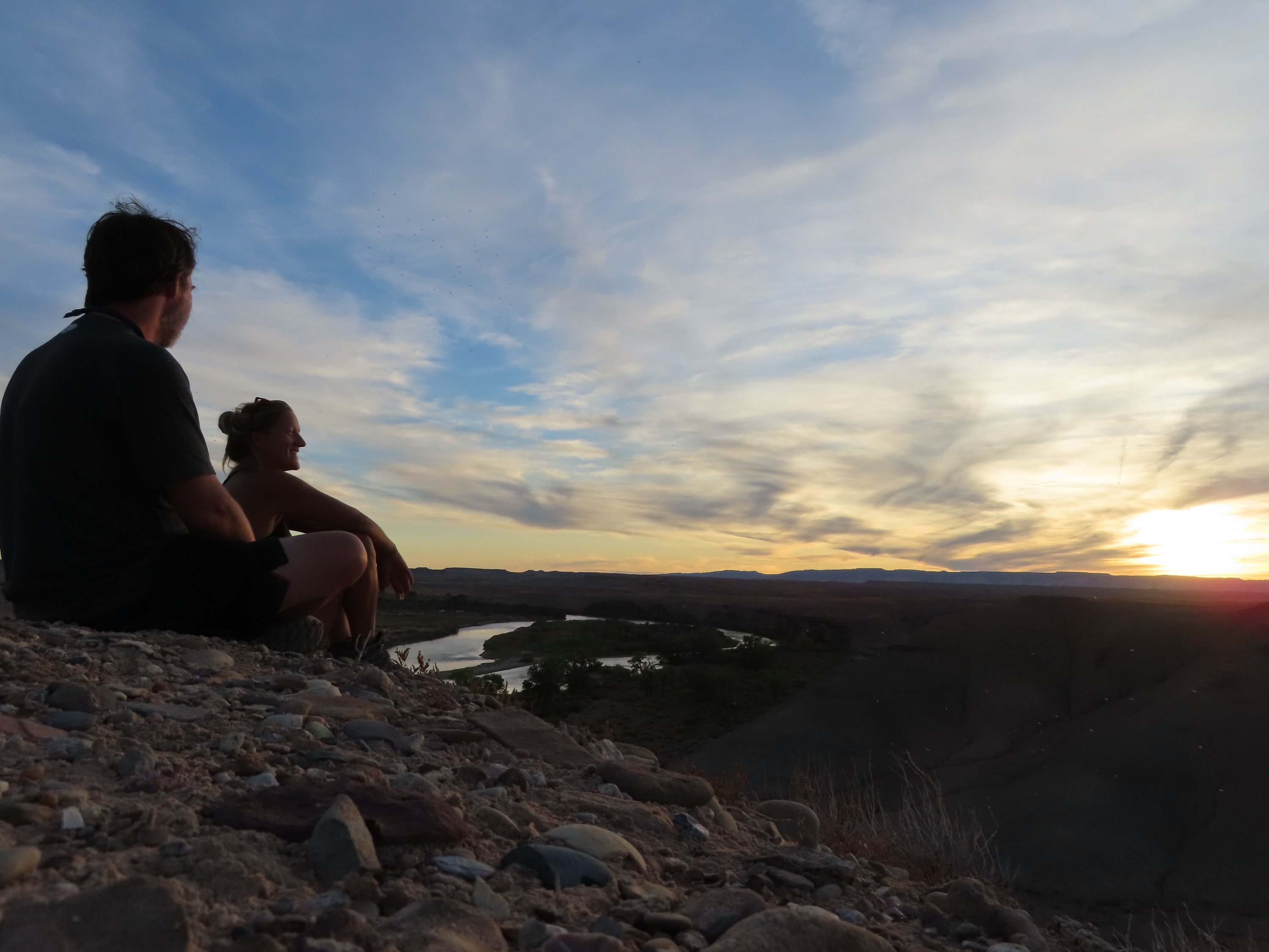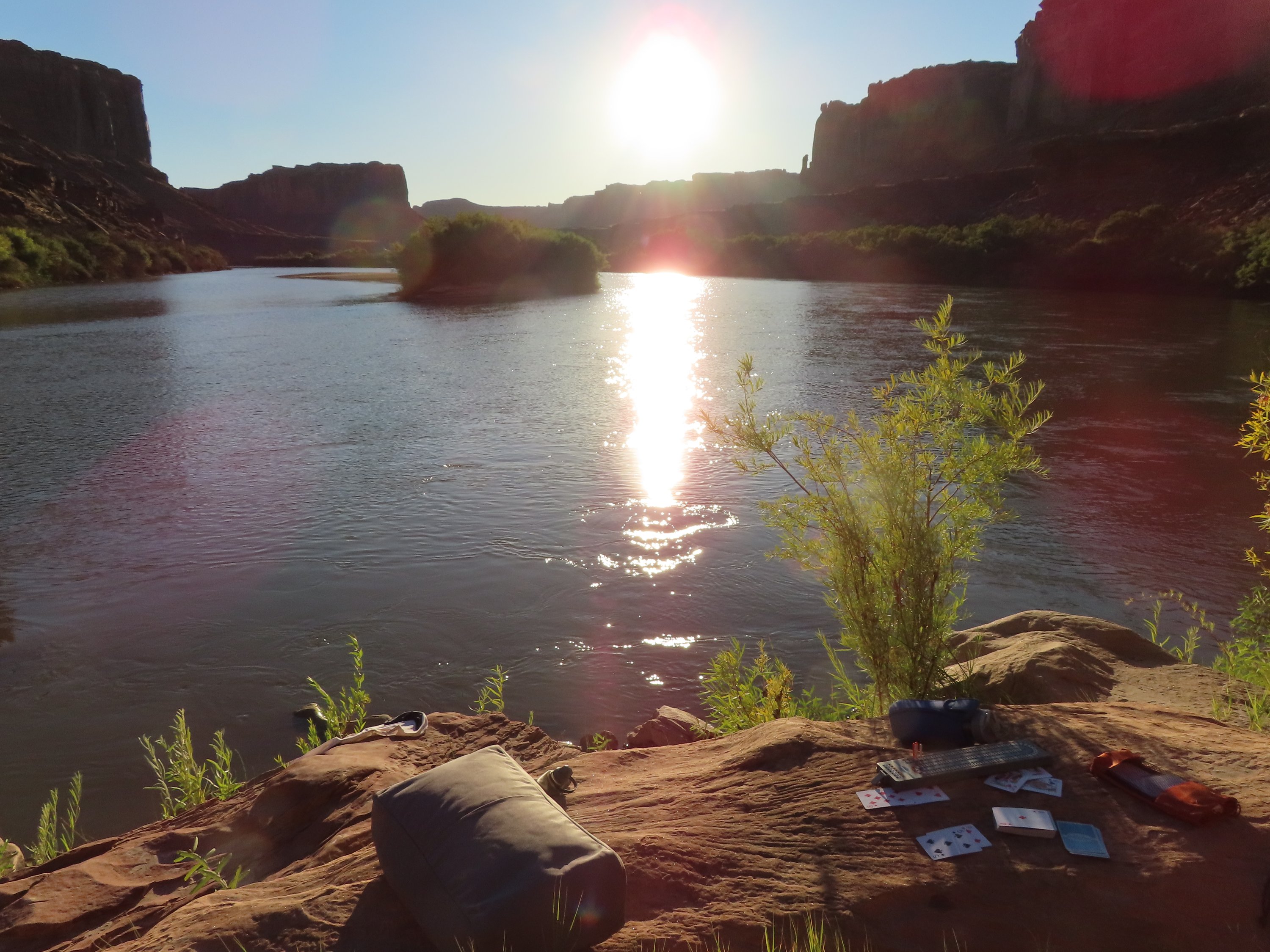 The weather for the seven days was almost perfect. Most days it was sunny and hot. The only challenge was not to get a sunburn. One night we had thunder and some rain. But then we also had the two days when there would be a powerful wind all day. The canyon felt like a wind tunnel, in some directions it was so intense it would create serious choppy waves. Sometimes it would come in gusts and it would be a challenge not have the boat turn sideways and flip. But paddling straight into that kind of wind was extremely strenuous. The first day we didn’t paddle very far. So we had to make up the next days and paddled some considerable miles despite the wind. But the weather could have been worse. So all in all we were really lucky. And were rewarded with the most incredible sky every night. Utah is known to be one of the places where due to very little light pollution the stars would be more visible than in other places. And that is what it felt like. Stars from horizon to horizon. Even the milky way had such depth it looked three dimensional. Which of course it is but hardly ever can be seen like that. The last night was most special when the moon was up early and close to the horizon in the west where we had just seen a stunning sunset. It was new moon and the way it was highlighted by the sun we could see the actual full moon despite only a small sliver being illuminated.