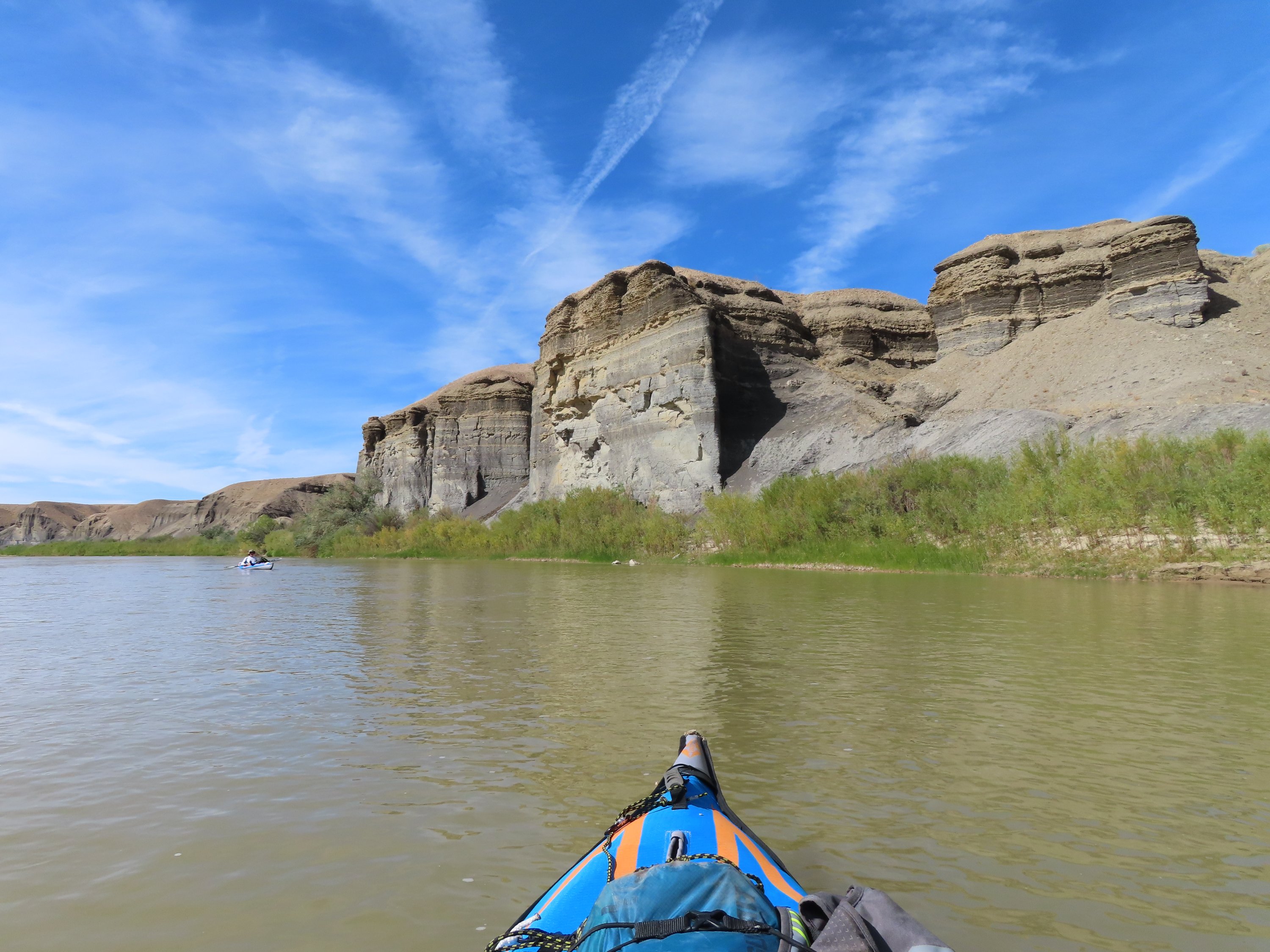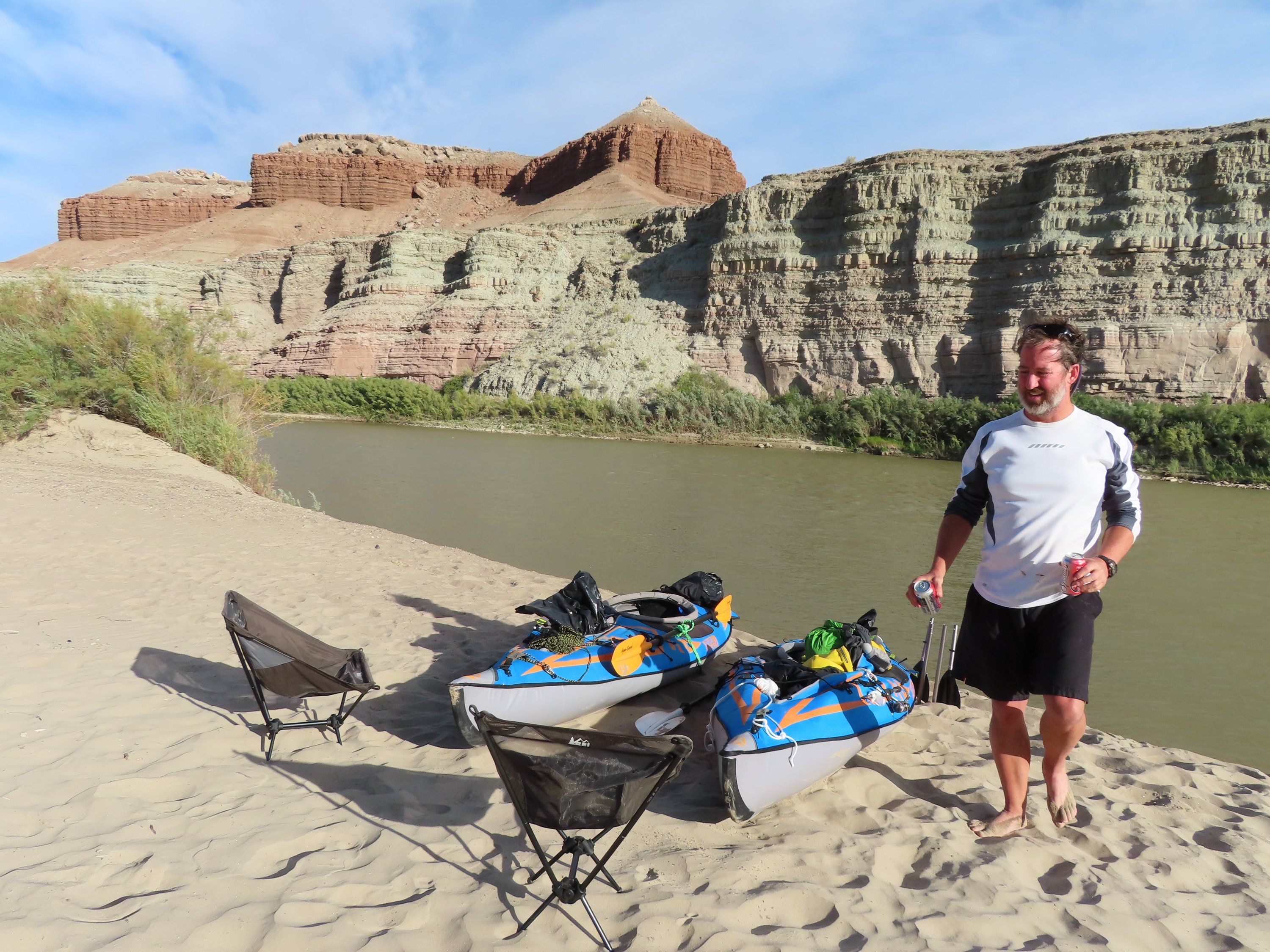 When the winds picked up pushing the waves actually upstream it was fun at first. But depending on the direction of the river the force of the wind would not only increase but would come in gusts. And they were so powerful that it took all our strength to keep the boat straight. Because once we got turned sideways with the boats being so narrow they could easily be flipped by the waves. Which we learned pretty quickly when Dan got baptized with a Splash. Still adapting to these sudden wind conditions we had been in the middle of the river when the gusts of wind became just too strong and we were not moving forward in the waves and keeping the boats straight became a real struggle. Since the water is calmer near the shores we made the decision to paddle there. But did it too abruptly instead of in an angle so of course the boats would turn sideways. And ended in a splash for Dan. Which was our scary moment because to have the boat flip in such turbulent water would make it difficult for Dan to get out of the water safely but also for me to help. But luckily Dan managed to flip the boat back and even get back in. So the immediate action was to turn back to paddle with and not into the wind and head for a sand bank a little further upstream. Where we learned again how powerful the wind could be as I had my boat pulled fully onto the sand when it got caught by the wind and was rolled and dragged over the sand. Despite it’s weight with all the gear in it. So after a rescue sprint, draining Dan’s boat and a breather we eventually had to get moving again as the sun was starting to set and the winds only seemed to get stronger. So we got back in the boats and continued paddling down the river hugging the shore as closely as possible. That night the winds kept howling but we had made it to a safe campsite and after Dan got all his gear out we found ourselves lucky, because the splash could have been way more serious but in the end meant that Dan had only lost one shoe, a water filter and a sponge. And we had a learnt some valuable lessons. Which we got tested on throughout the next day where we pretty much paddled through winds and waves the whole day. We had to make up some mileage so we couldn’t rest. So lesson number one was to stay close to the shore as the currents and waves there are less intense and in the best case push the opposite way and with that downriver which was the most important one to stay safe and to be able to move forward saving energy. Then lesson number two was that if in the middle of the river and the waves and wind became too powerful and when making the decision to move closer to the shore to do so at an angle to keep the boat straight. Because not only the wave can flip the boat but it is a real struggle to keep in control because not only the boat but also the body is hit by these unbelievably forceful gusts of wind. We learned to read the water. We could see ahead to anticipate those winds after a while. Or see sudden ripples coming towards us and give warning that a few seconds later we would get struck by those gusts. And with that also learned lesson number three which is that the wind has a temper that rises and ebbs. One time it became too strong and despite being really close to the shore we got caught in a very violent burst that forced us to stop at the embankment. So we learnt to wait for these moments when it would calm down enough to continue. Number four was the enforced lessons of „Yes, tie EVERYTHING down to the boat“! Lesson number five was to enjoy floating. Which is what we did the next day when the wind had calmed down and we would literally just hang out in our boats and let the current float us down the river through this beautiful canyon. And lesson number six is how good even warm beer tastes at the end of a exhausting paddling day.