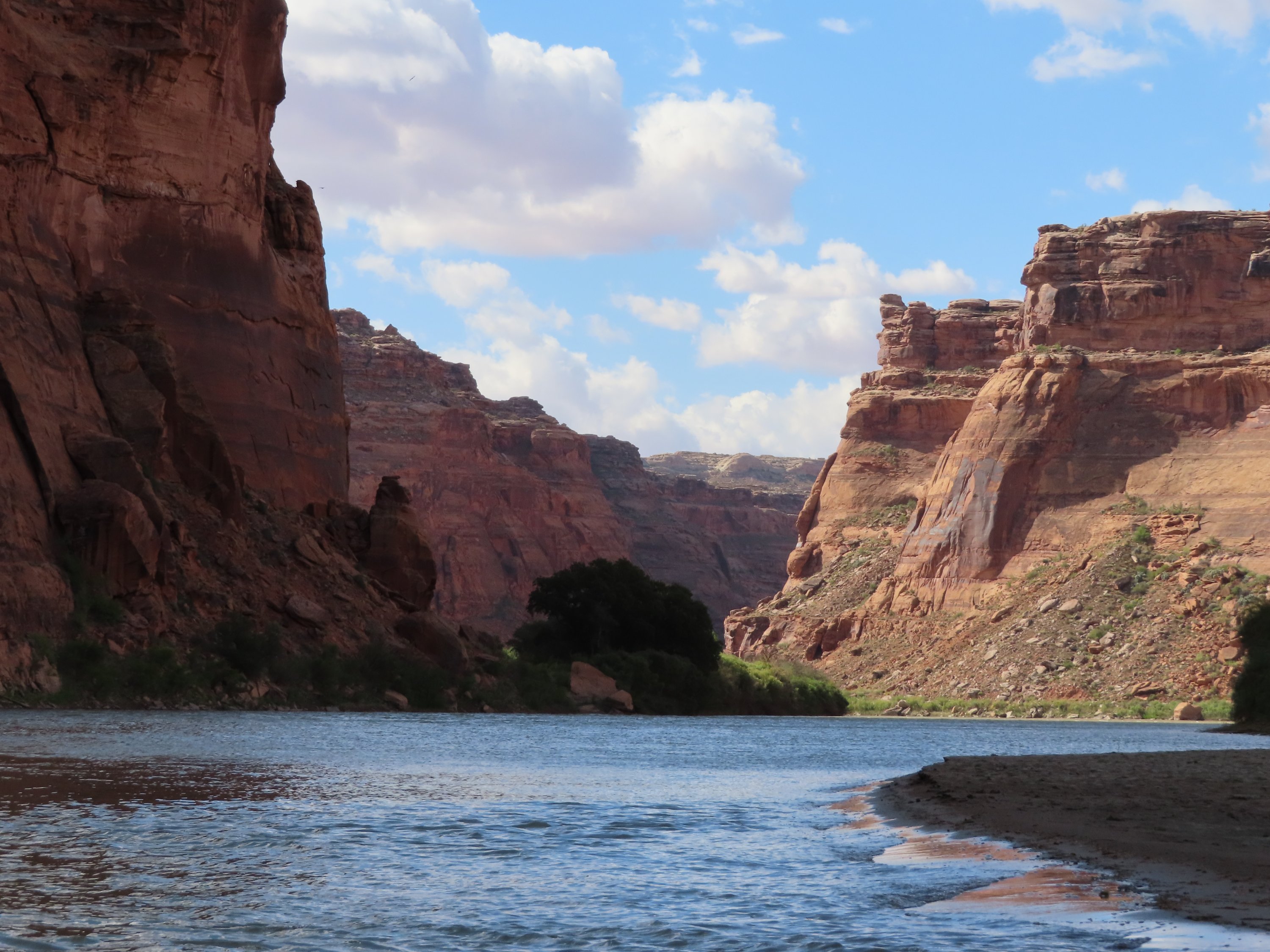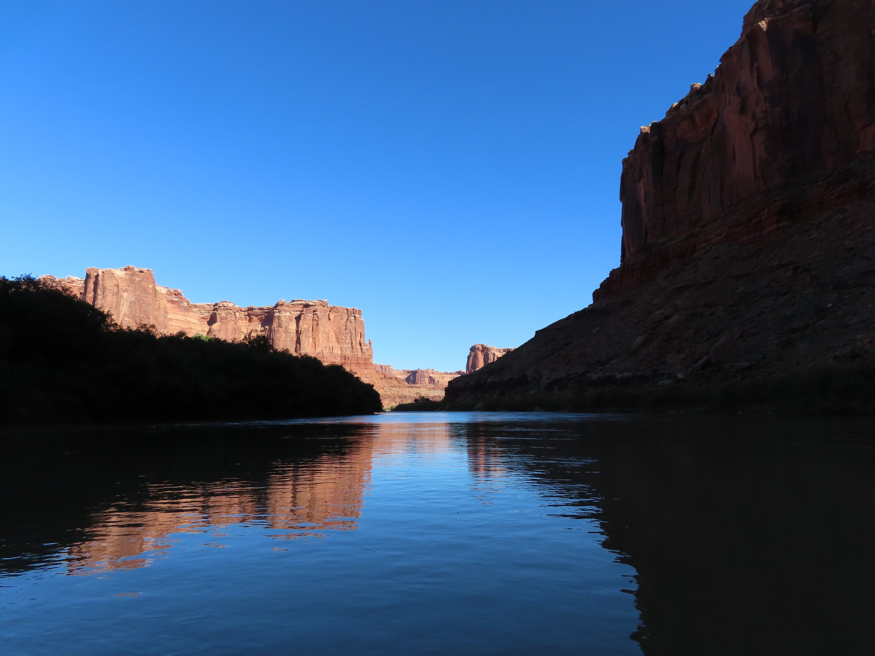 Das Wetter für die sieben Tage war fast perfekt. Meistens war es sonnig und heiß. Die einzige Herausforderung war keinen Sonnenbrand zu bekommen. Eine Nacht hatten wir Donner und etwas Regen. Aber dann hatten wir auch die beiden Tage, an denen den ganzen Tag über ein starker Wind wehte. Der Canyon fühlte sich wie ein Windkanal an, in einigen Richtungen war der Wind so intensiv, dass er sehr starke Wellen erzeugte. Manchmal gab es richtige Böen und es war eine Herausforderung, das Boot nicht seitlich drehen und umkippen zu lassen. Direkt in diesen Wind zu paddeln, war extrem anstrengend. Am ersten Tag sind wir nicht sehr weit gekommen. So mussten wir die nächsten Tage wieder aufholen und sind trotz des Windes einige beachtliche Kilometer gepaddelt. Aber das Wetter hätte schlechter sein können. Alles in allem hatten wir also wirklich Glück. Und wurden jede Nacht mit dem unglaublichsten Himmel belohnt. Utah ist bekannt als einer der Orte, an dem die Sterne aufgrund der geringen Lichtverschmutzung besser sichtbar sind als an anderen Orten. Und so fühlte es sich an. Sterne von Horizont zu Horizont. Selbst die Milchstraße hatte eine solche Tiefe, dass sie dreidimensional aussah. Was sie natürlich ist, aber eben kaum jemals so zu sehen ist. Die letzte Nacht war dann etwas ganz Besonderes, als der Mond früh und nah am Horizont im Westen aufging, wo wir gerade einen atemberaubenden Sonnenuntergang gesehen hatten. Es war Neumond und die Art und Weise, wie er von der Sonne beleuchtet wurde, konnten wir den kompletten Mond in seinem Schatten sehen, obwohl nur die Sichel hell erschien.